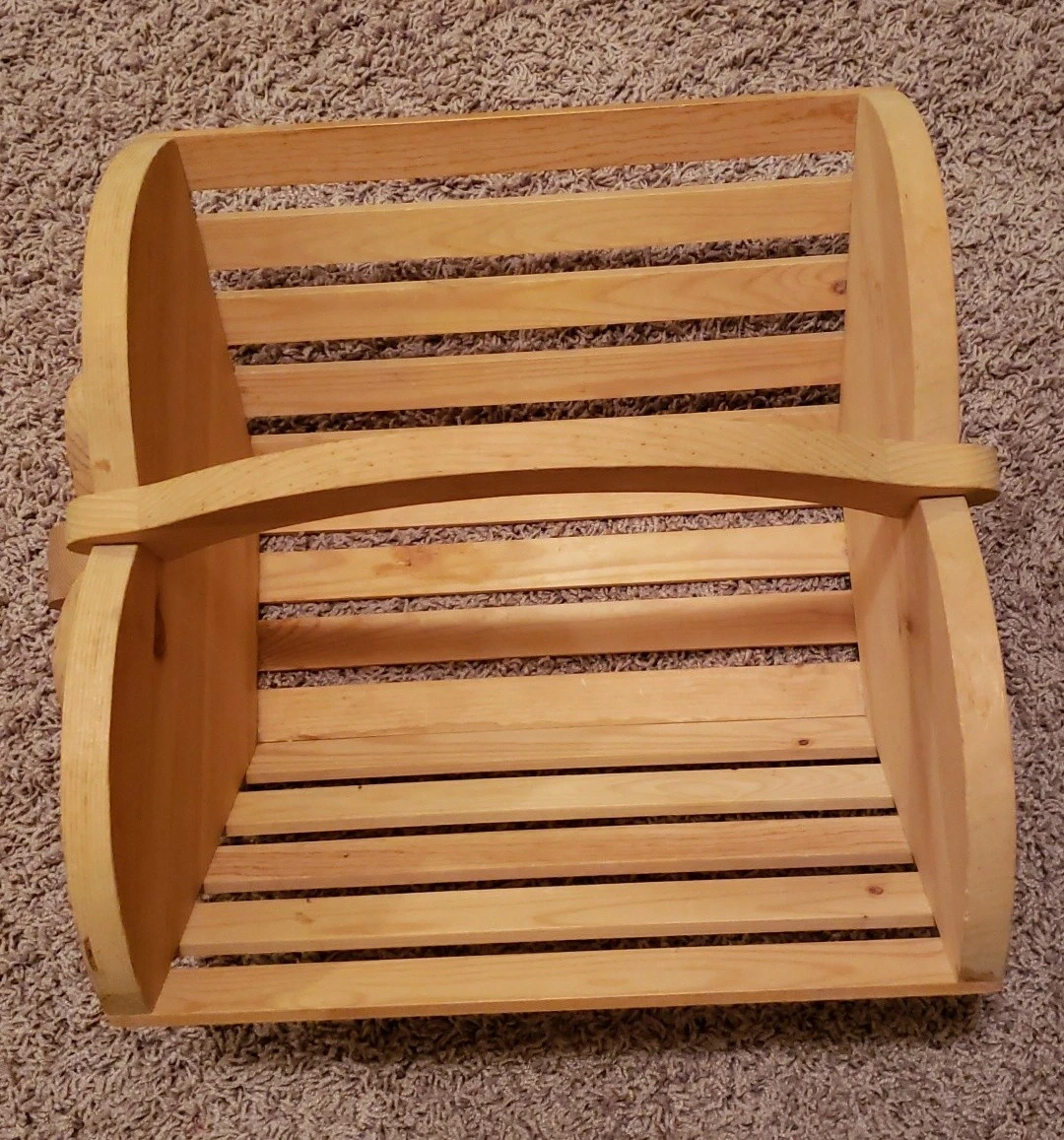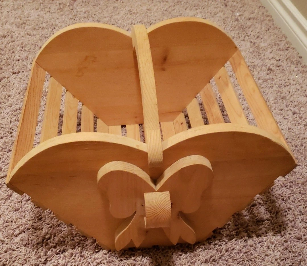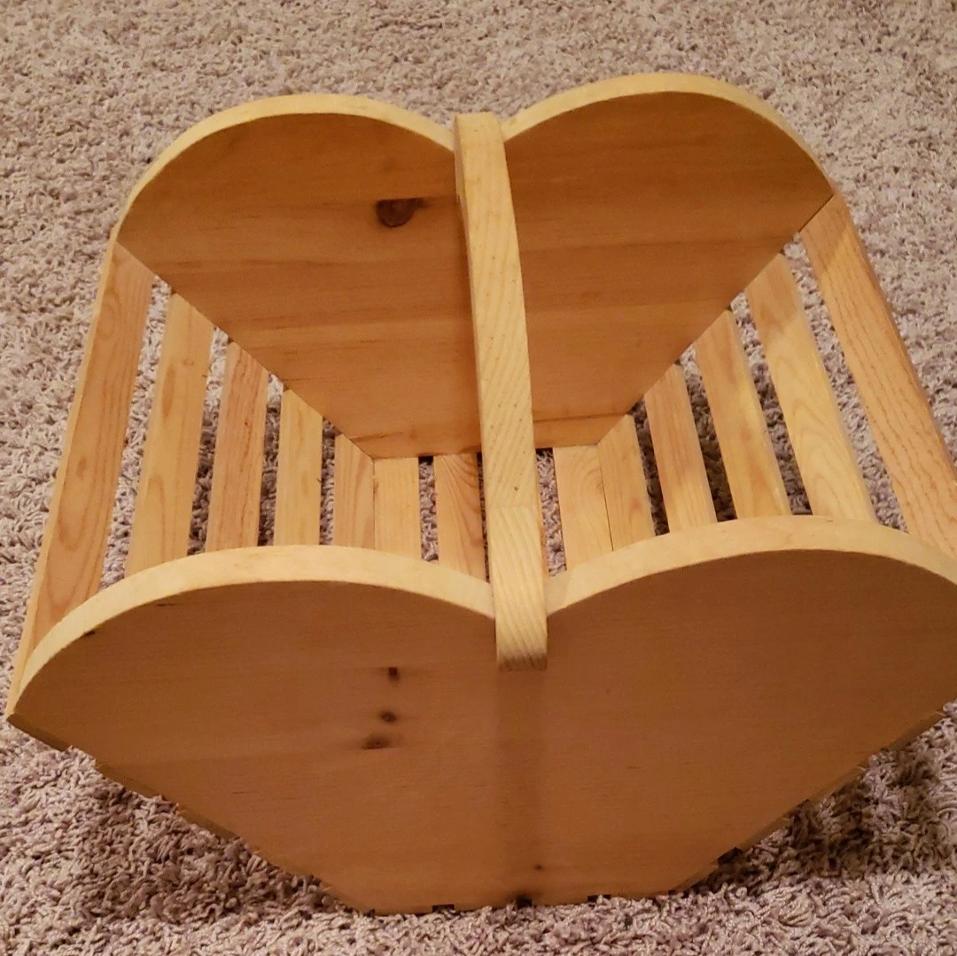 Charming light-coloured wooden basket. Features a unique bow detail and convenient carrying handle. Ideal for storage or display. Made of wood.