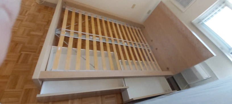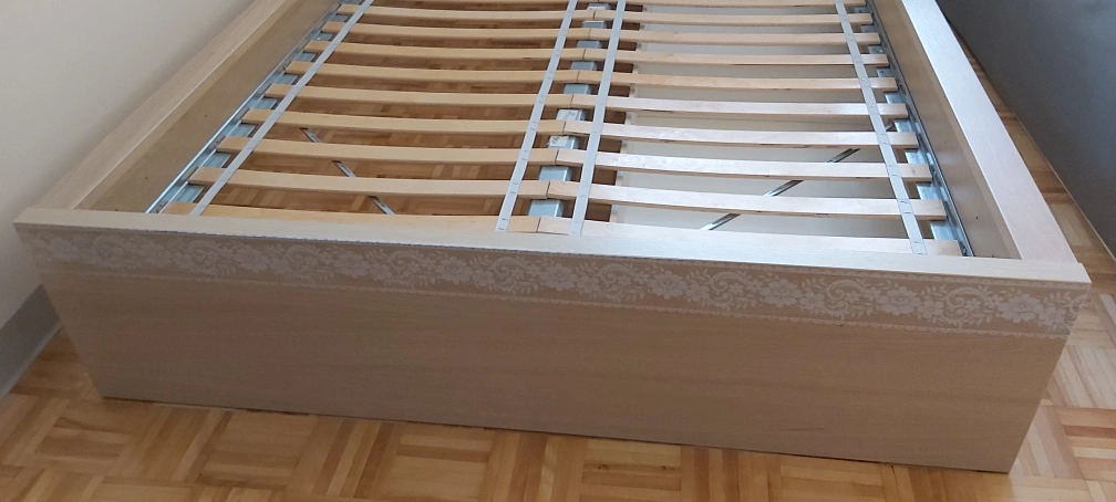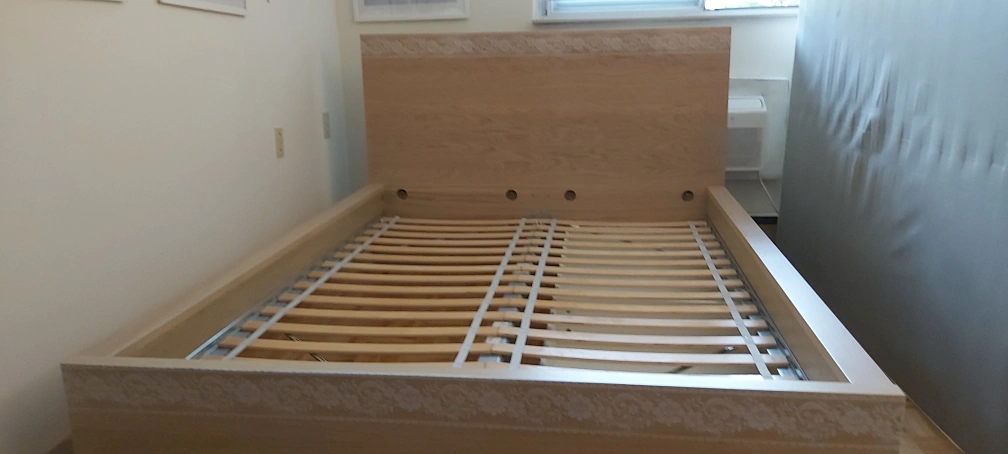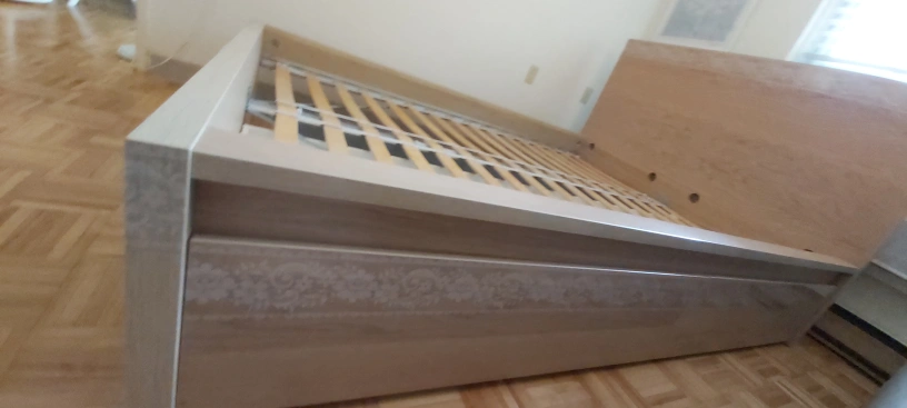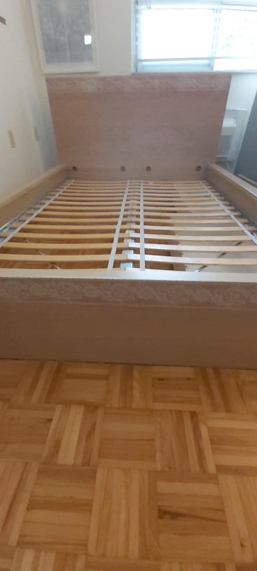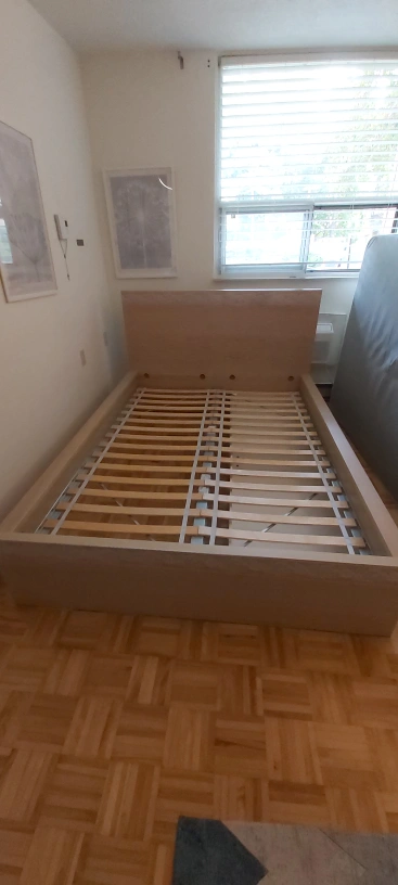 Full size Ikea Malm bed with 2 pull out storage drawers on wheels. color: Oak veneer will come disassembled for pickup. great condition with Charming lace edges , as shown on photos