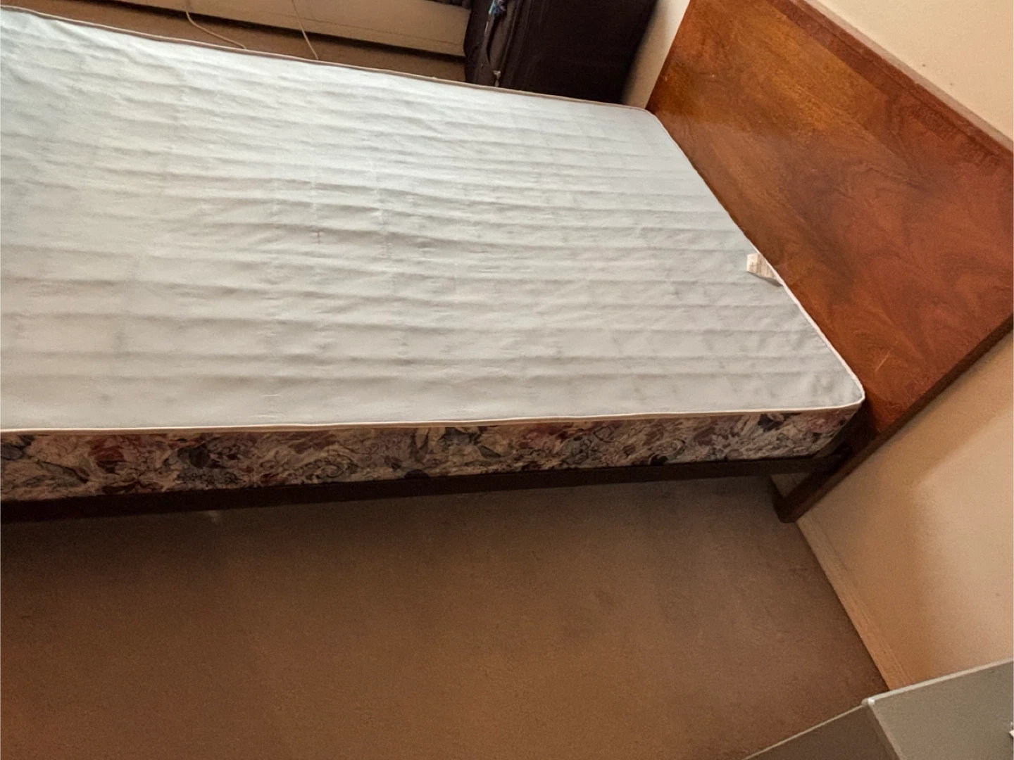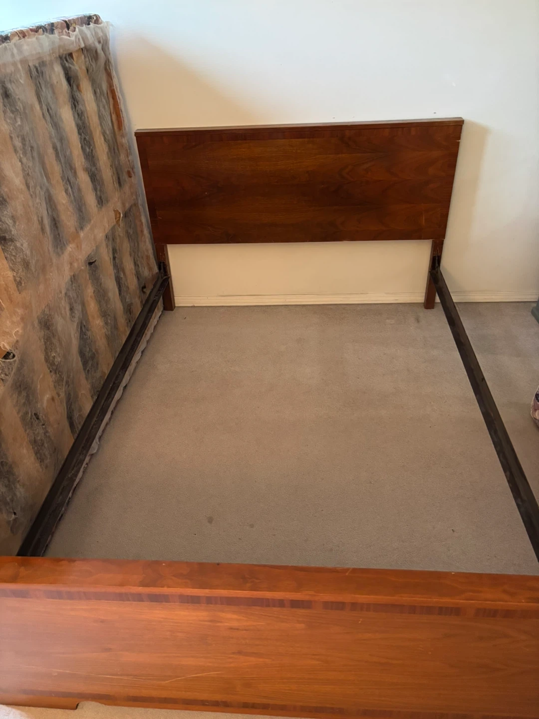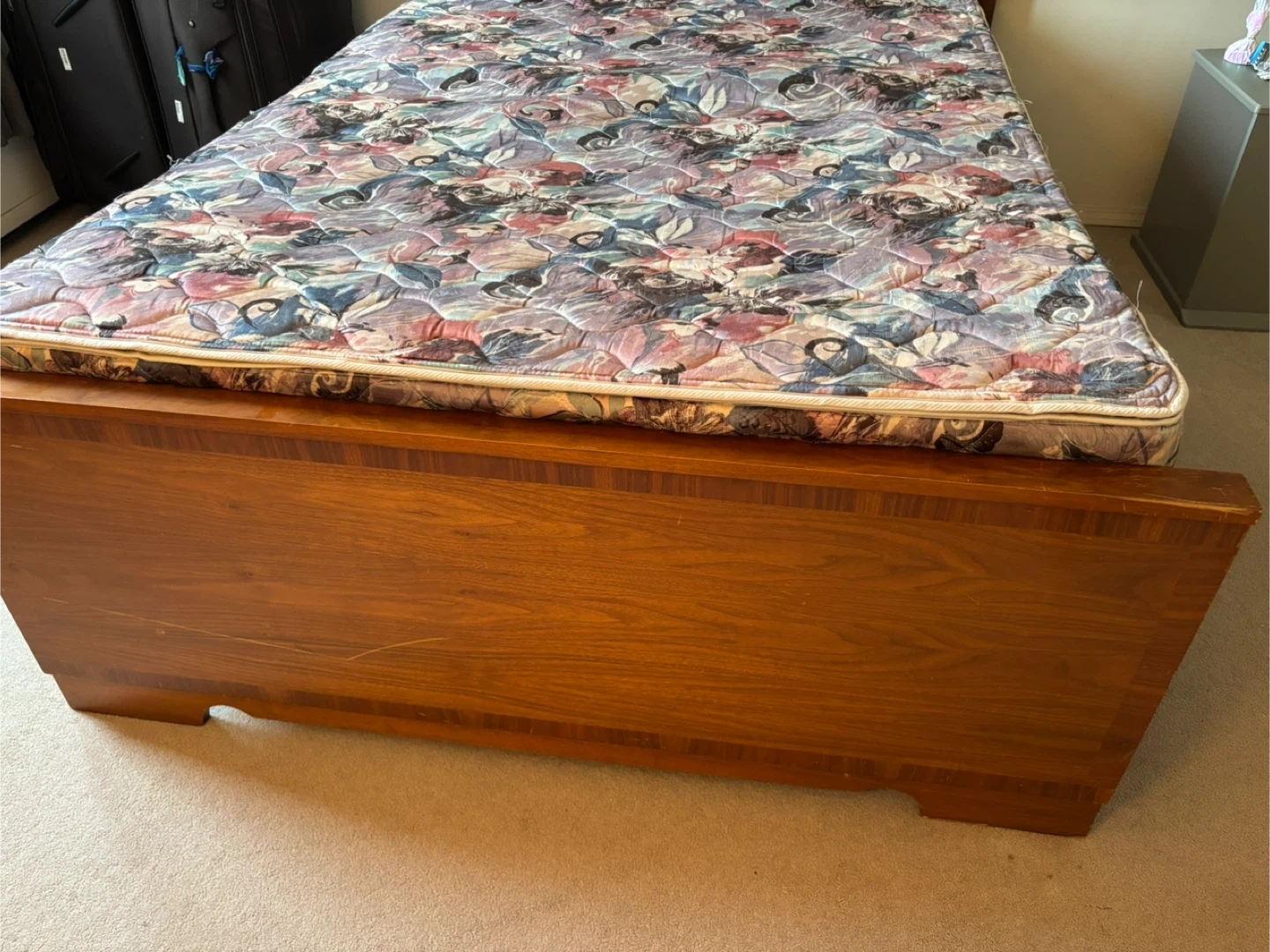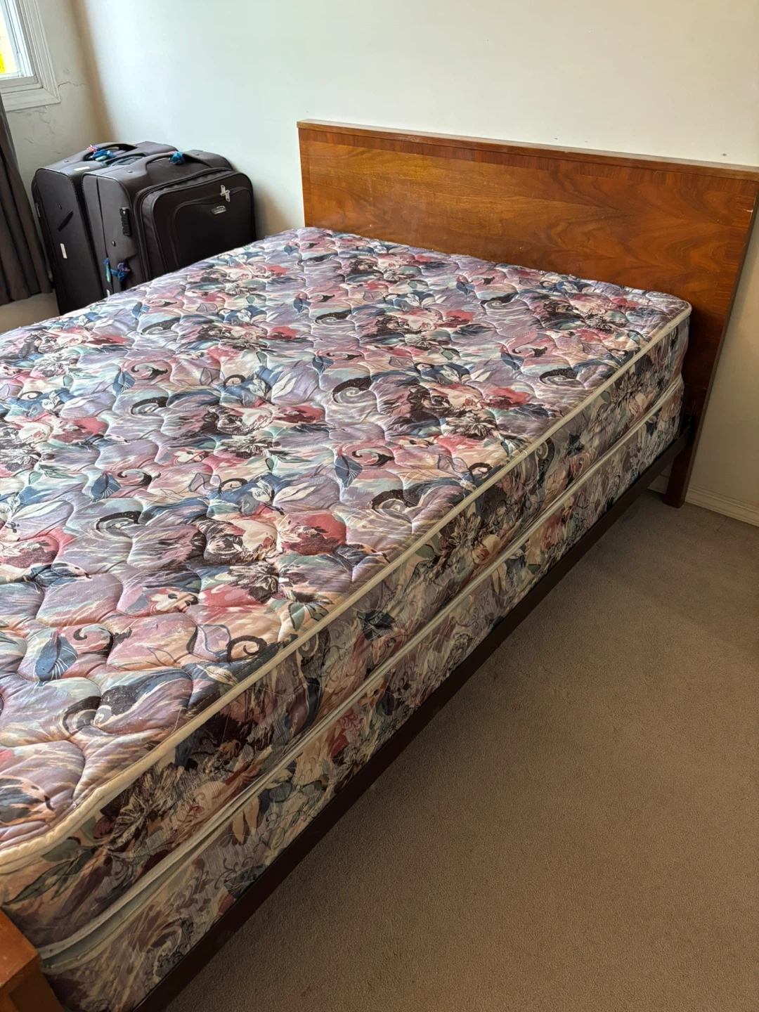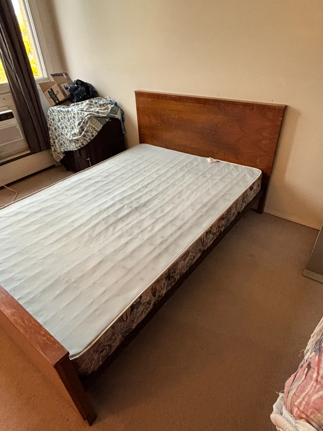 Selling a wooden bed frame with a mattress. The frame and the mattress is in good condition. Smoke and pet free apartment. Approximate dimensions LxBxH 71”x51”x24” Perfect for a bedroom! Pickup only, bring help along.