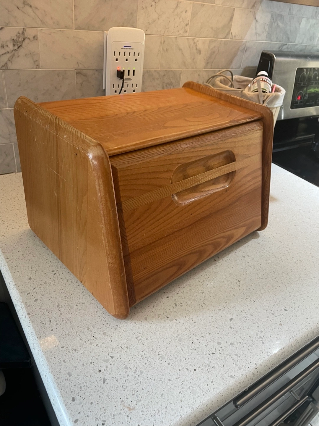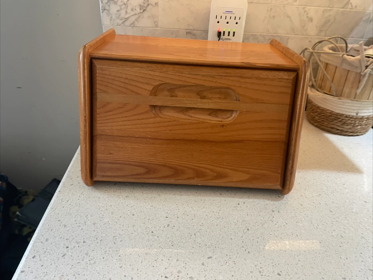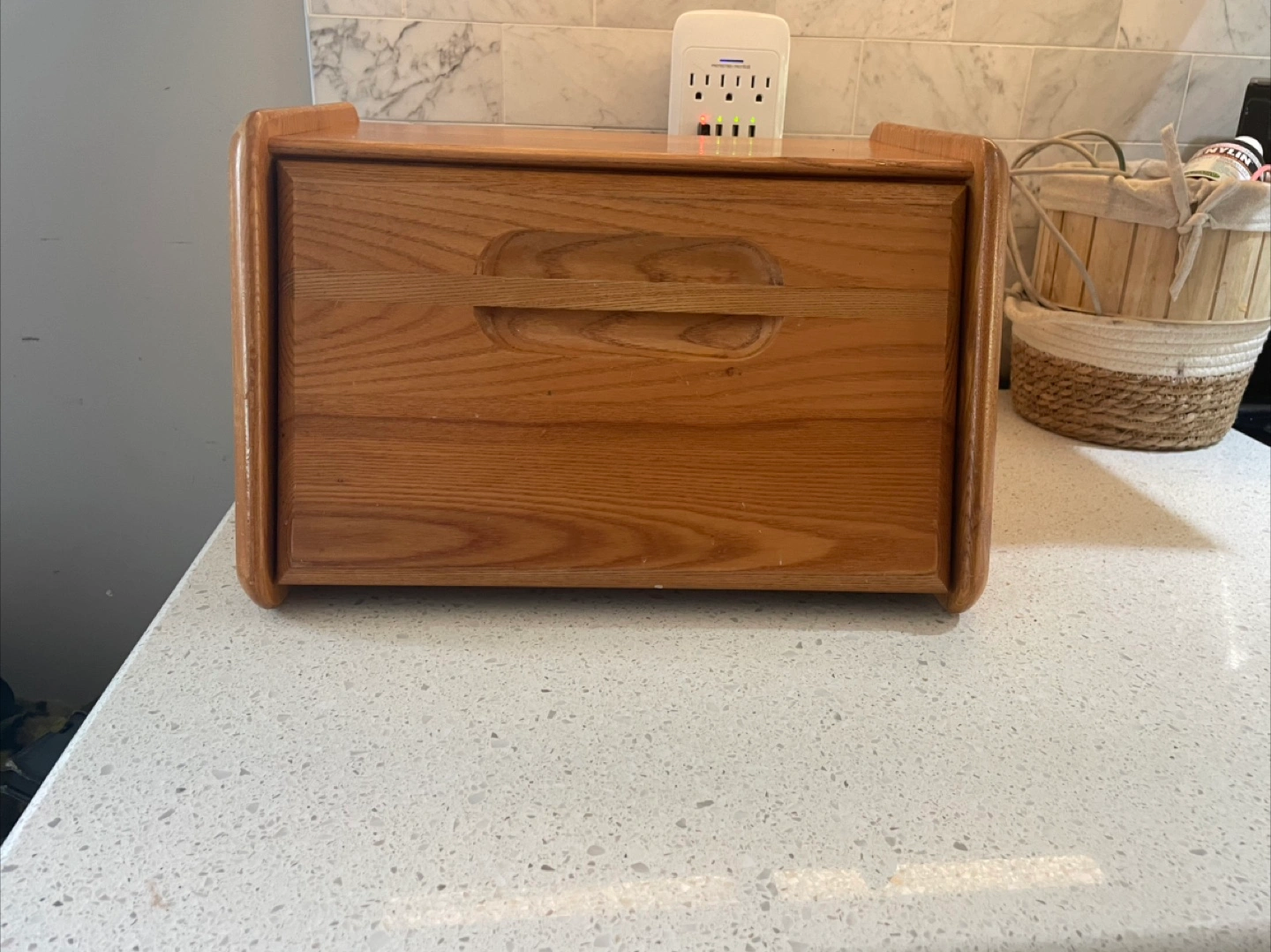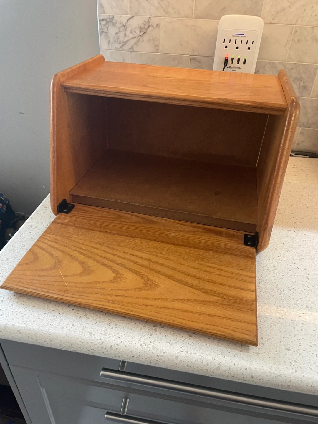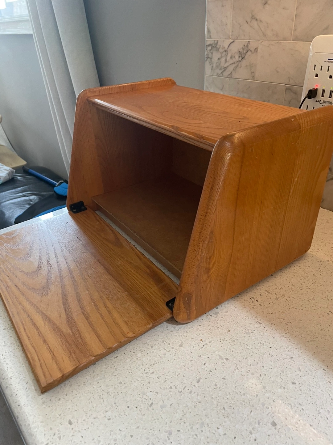 Selling a wooden bread box in good condition. It's perfect for keeping your bread fresh and organized on your countertop. It has a natural wood finish that will complement any kitchen decor
