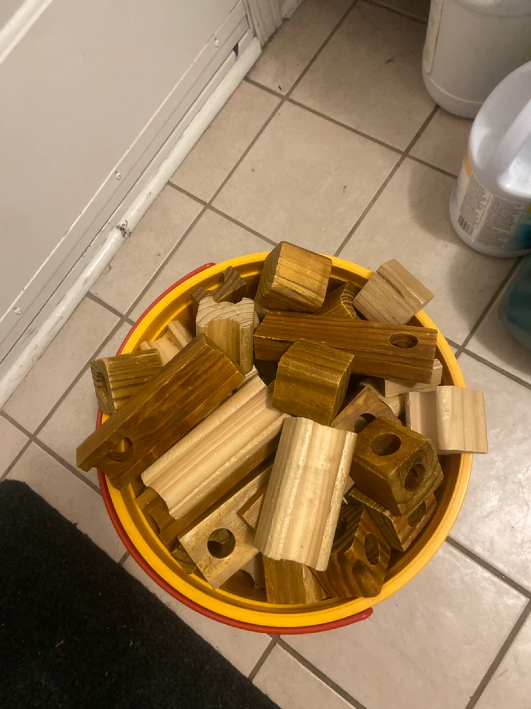 Selling a bucket of wooden building blocks. Great for kids to build and play with. Some are stained a darker colour and some are natural wood.