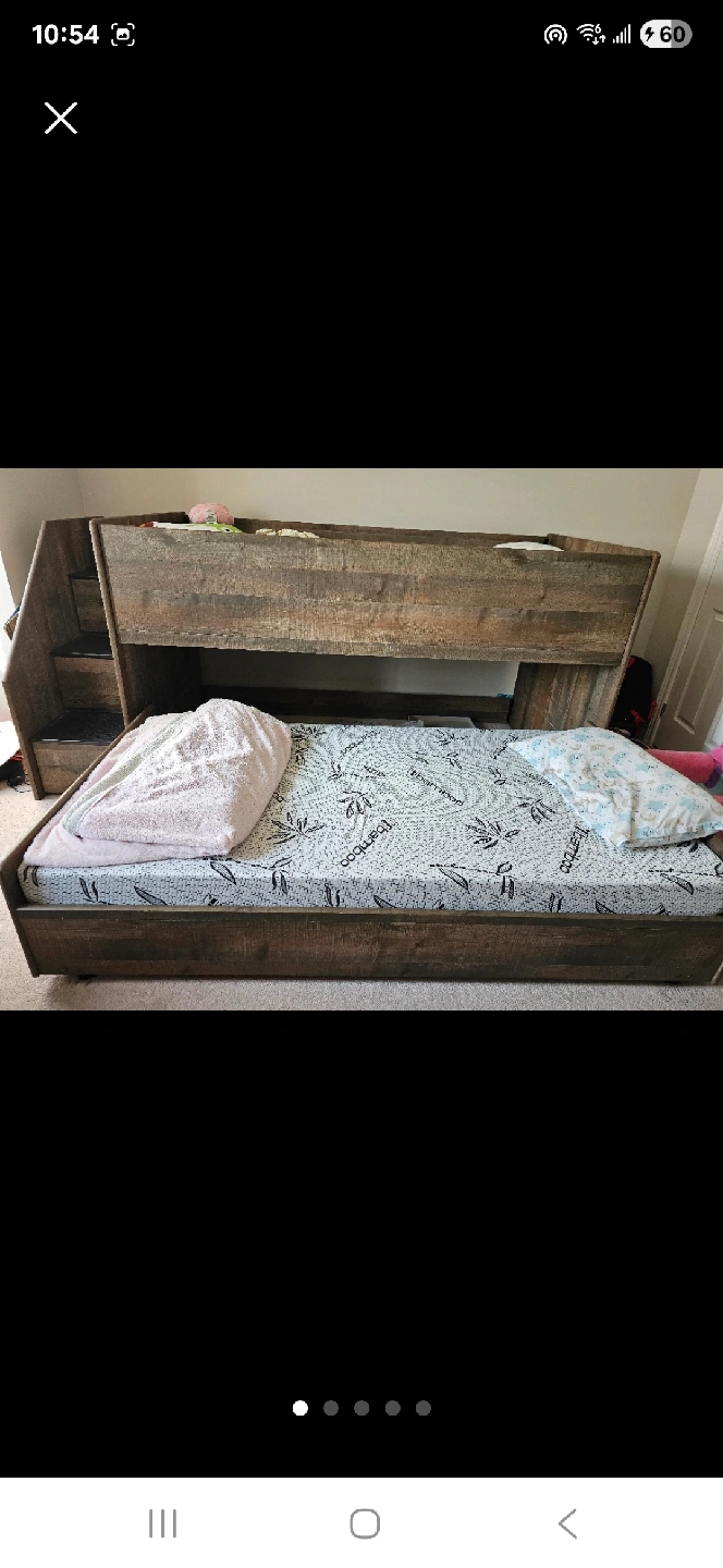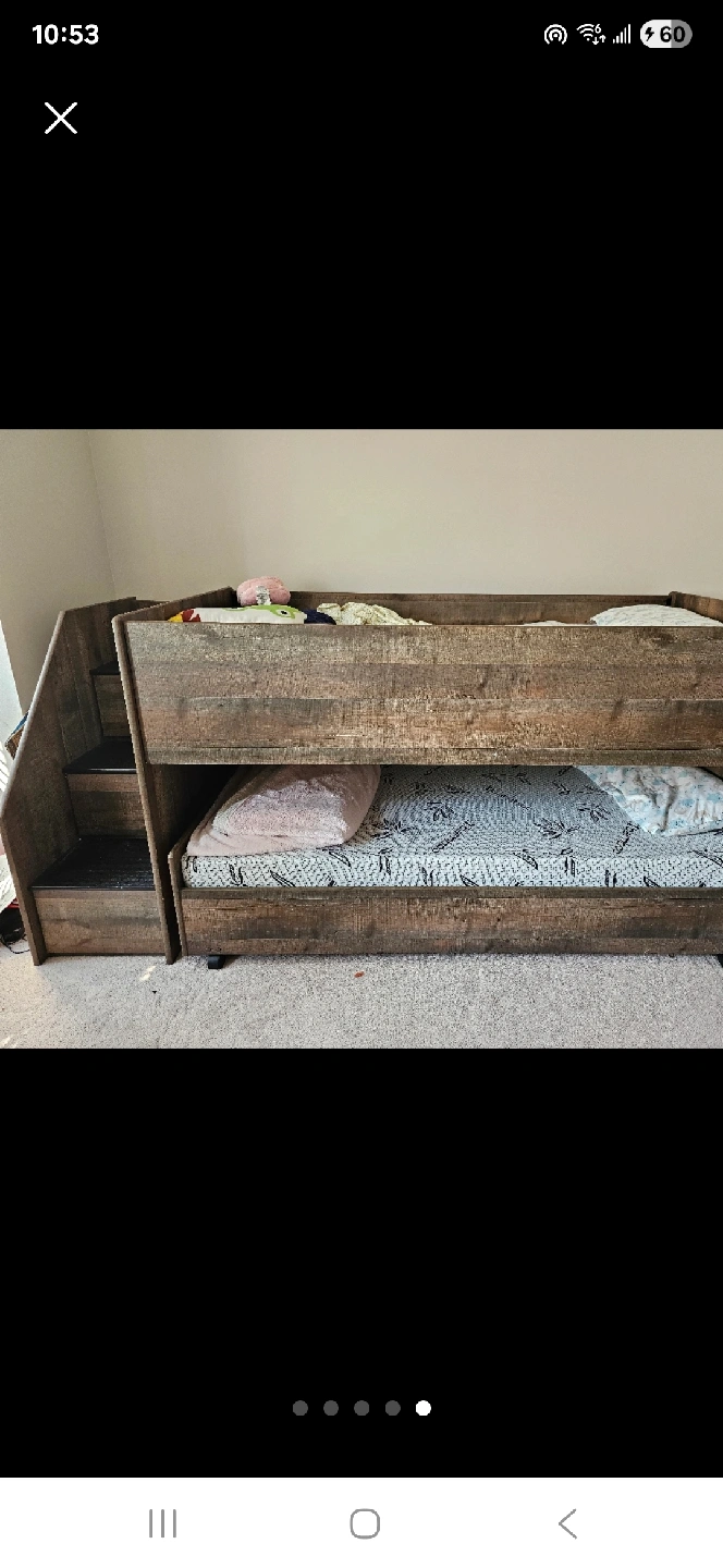 Selling a wooden bunk bed with stairs. It's in good condition and perfect for a kids' room or guest room. The stairs make it easy to climb up to the top bunk! It has dresser and a night table for additional price. pls dm