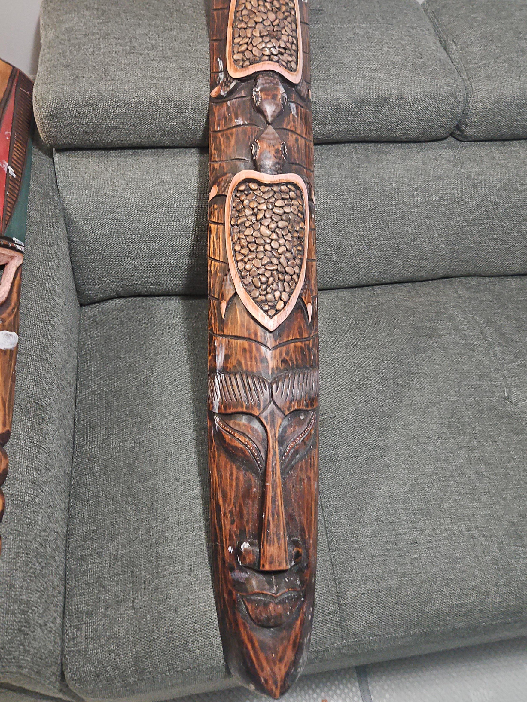 Selling a unique wooden carved tiki mask. It has a distinctive design with turtle motifs and a face carving. It would make a great addition to any collection or as a decorative piece for your home