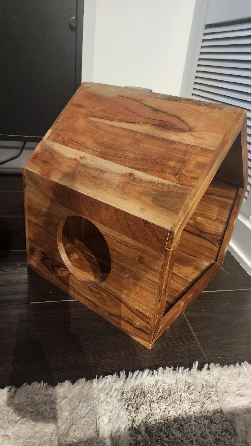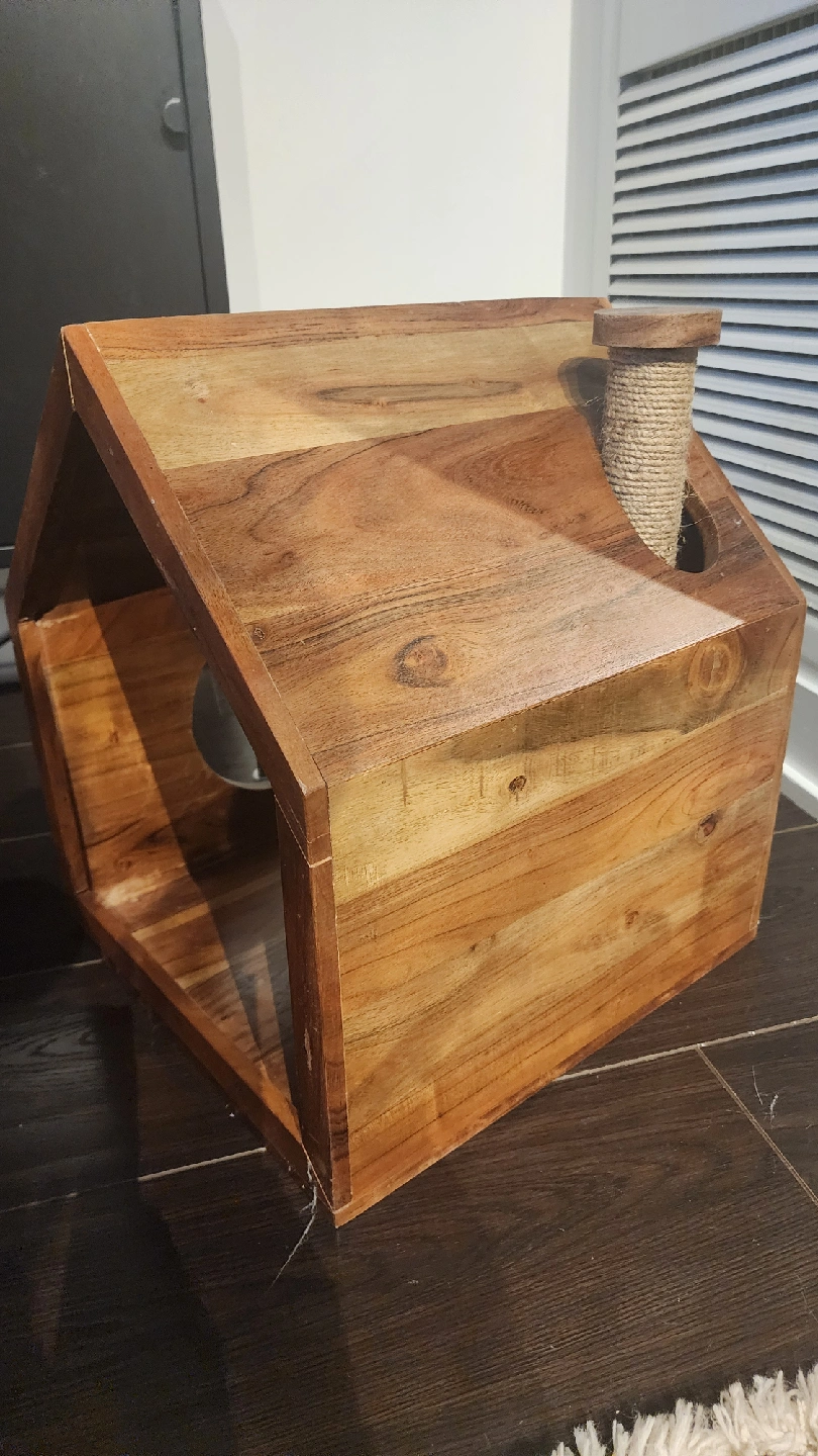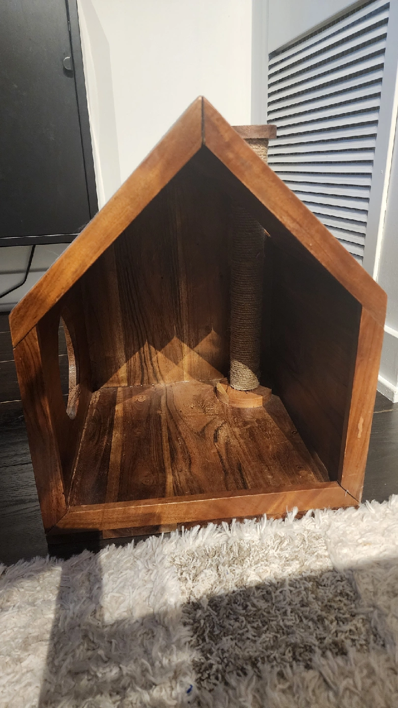 Selling a cute wooden cat house! It's in great shape and features a scratching post to keep your kitty entertained. Perfect for a cozy nap or playtime