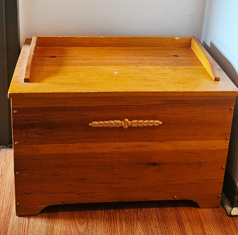 Selling a wooden cedar chest. It's great for storing blankets, clothes, or other items. It has a classic look with a decorative front. There are some markings on inside the top of the chest that can be cleaned. From a smoke-free, pet-free home. Bundle discounts are available—feel free to browse my other listings. Thanks for looking! 😊🙏
