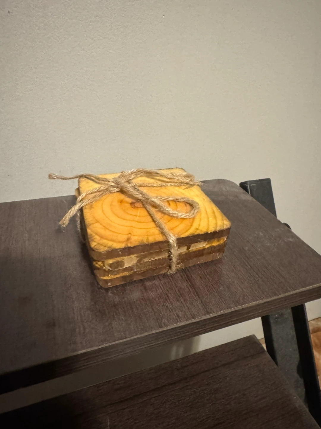 Four handmade wooden coasters sealed with a gloss varnish, which makes them waterproof