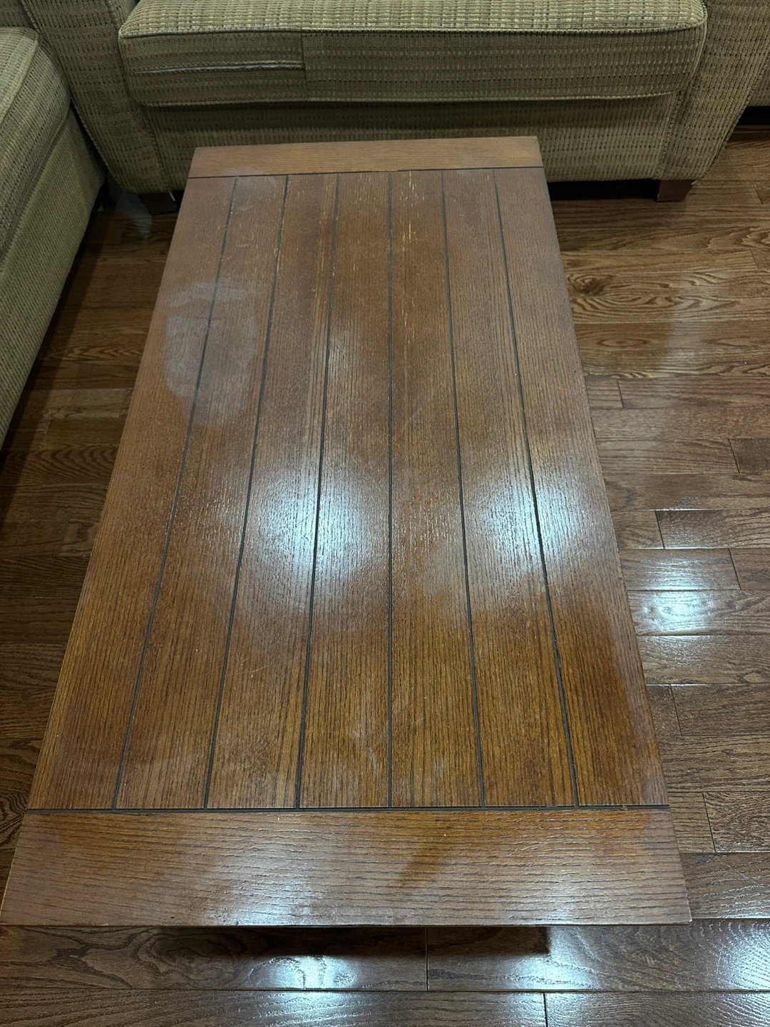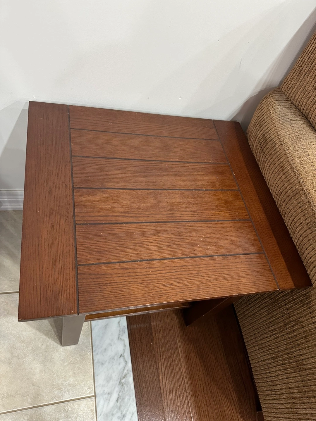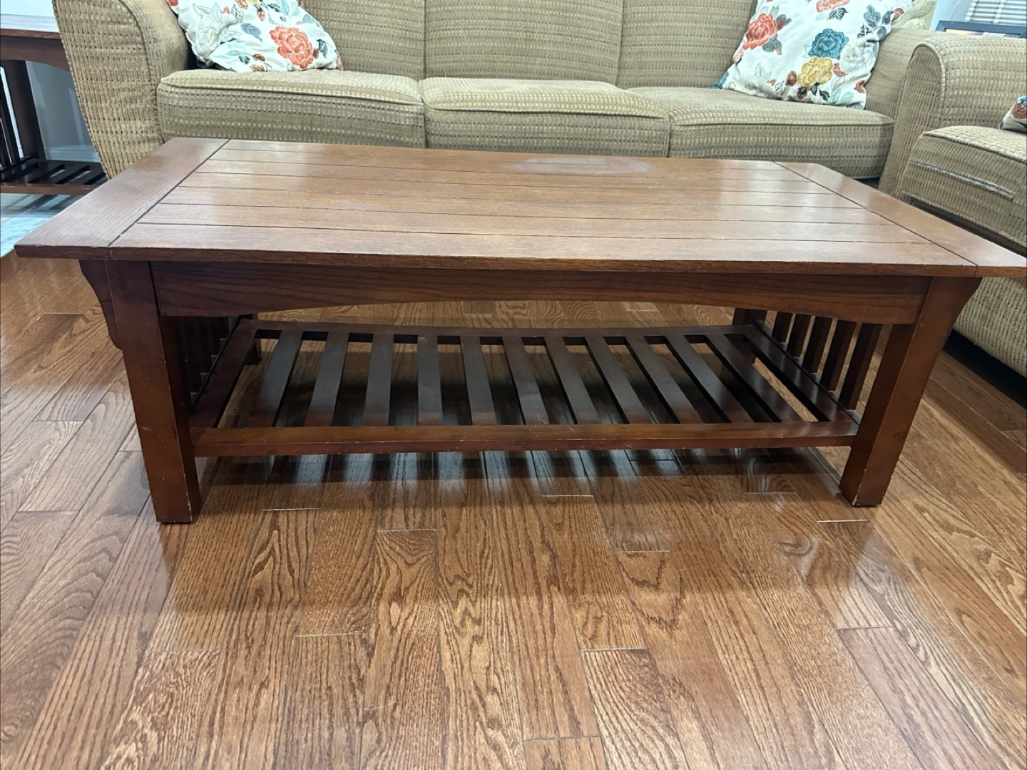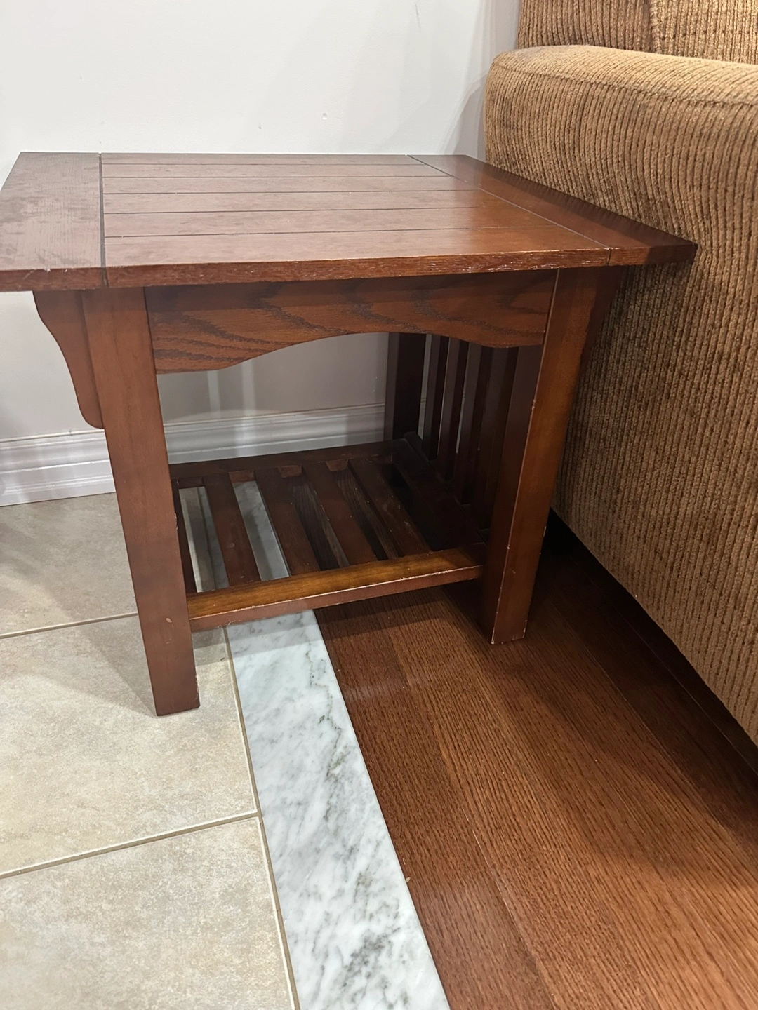 Selling a matching coffee table and 2 side table set. Both are made of wood and have a classic design. They show some signs of use but are still sturdy and functional. Perfect for a living room or family room! $150 OBO