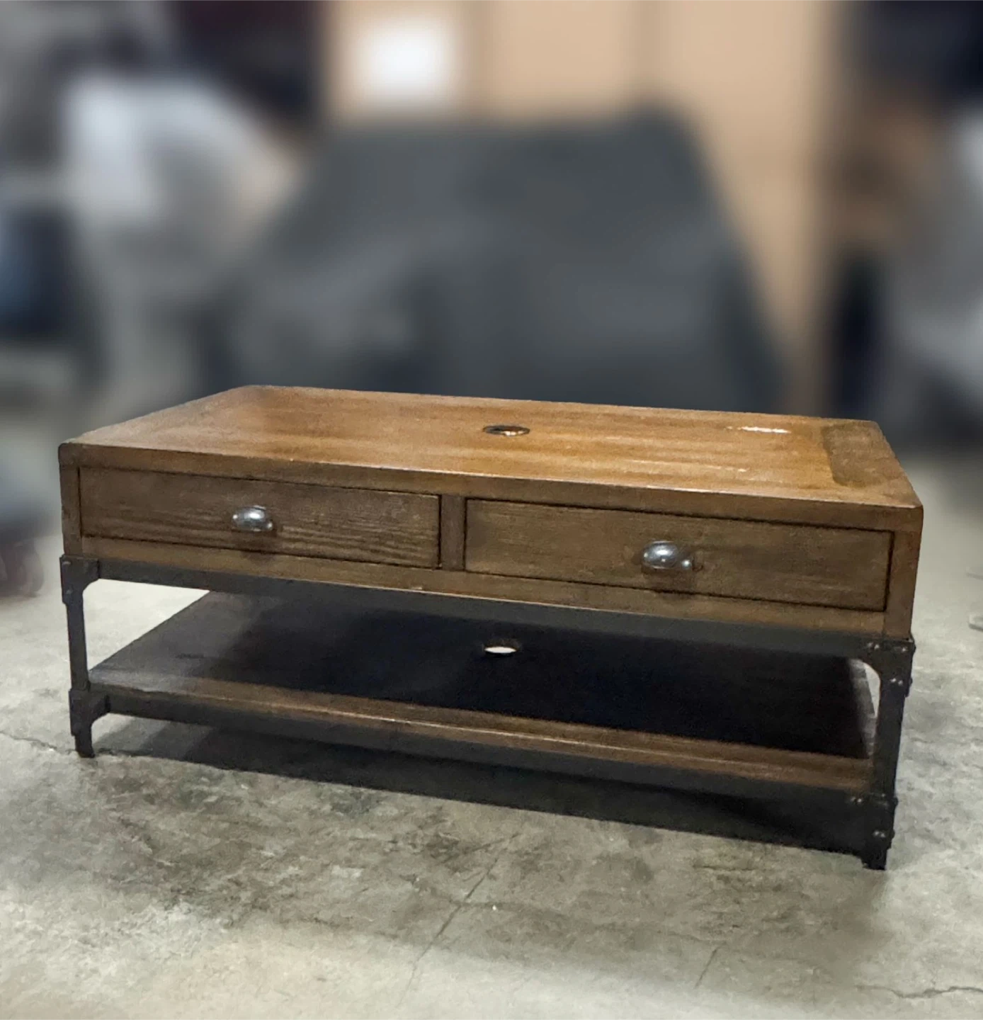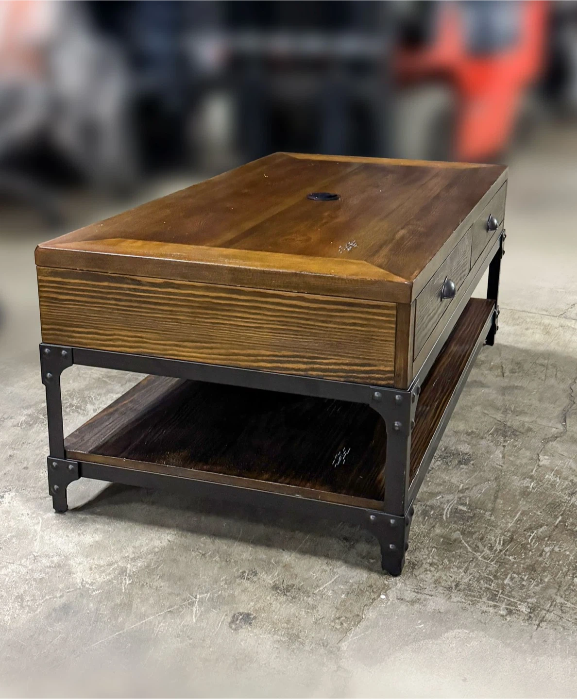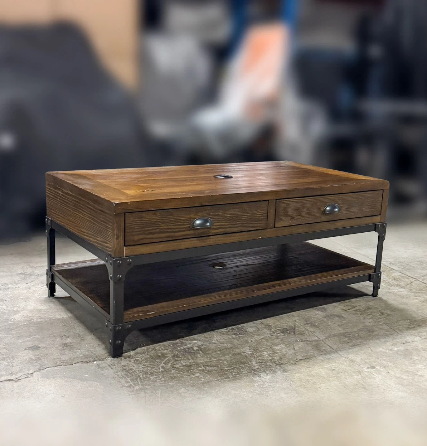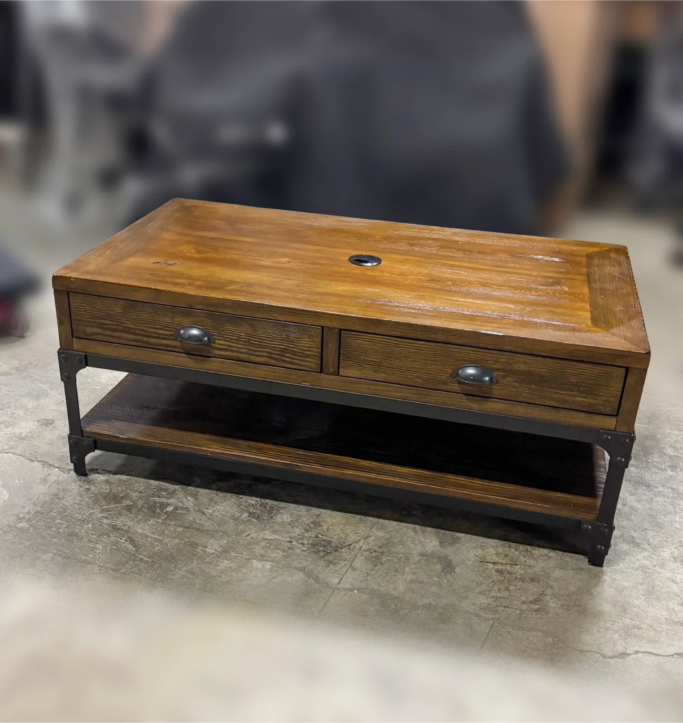 Bring character and storage to your living space with this solid wood and metal-frame coffee table. Perfect blend of rustic charm and industrial design – built to last and stylish in any home. 🪵 Features: • Solid wood top with rich walnut finish • Sturdy black metal frame with rivet details • 2 pull-out storage drawers with vintage hardware • Open bottom shelf for extra storage or décor • Center grommet for cable management (can be left as-is or used for electronics setup) 📏 Dimensions: Approx. 42” L x 24” W x 18” H 💸 Asking $150 CAD 📍 Located in Mississauga – pick-up only