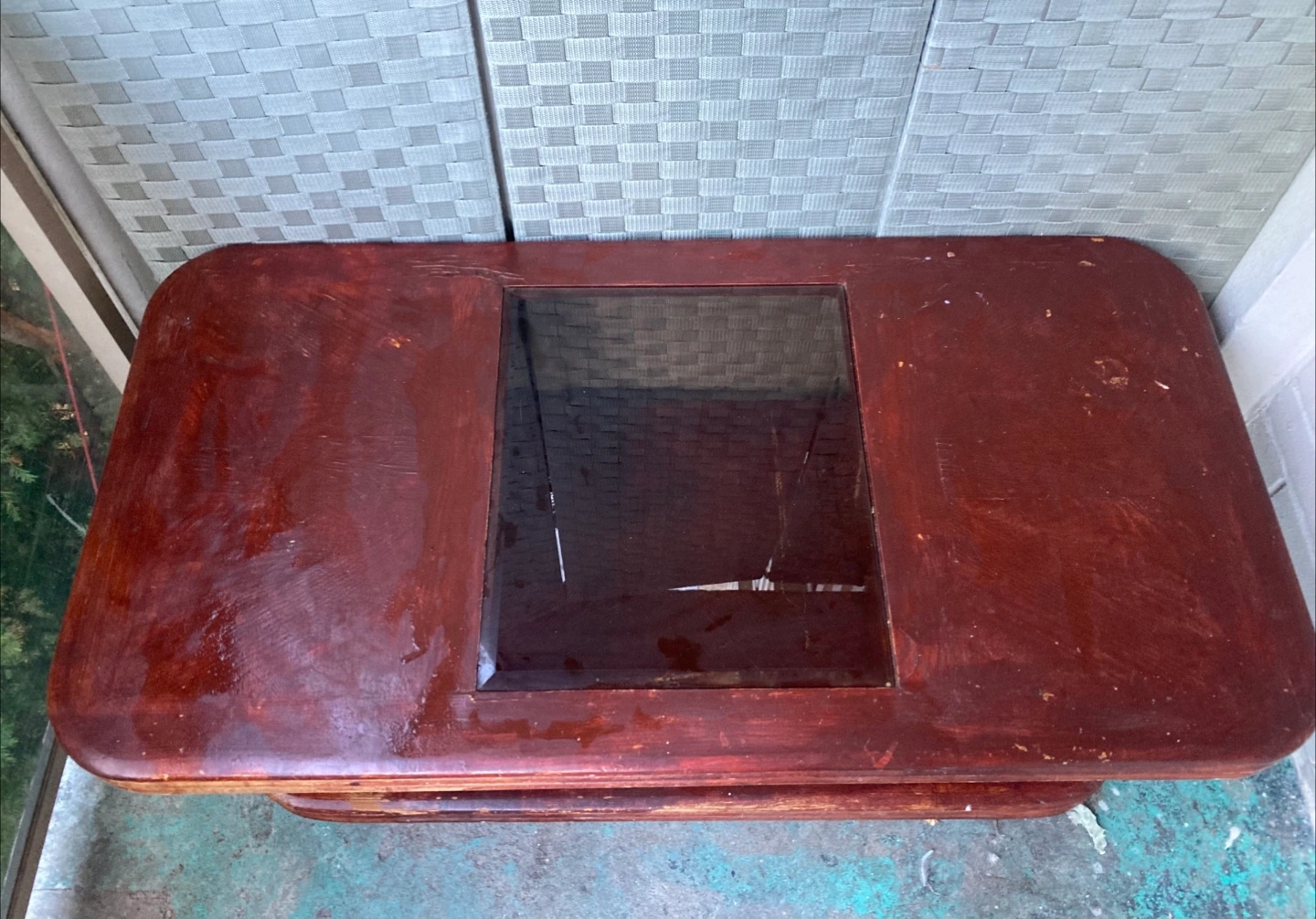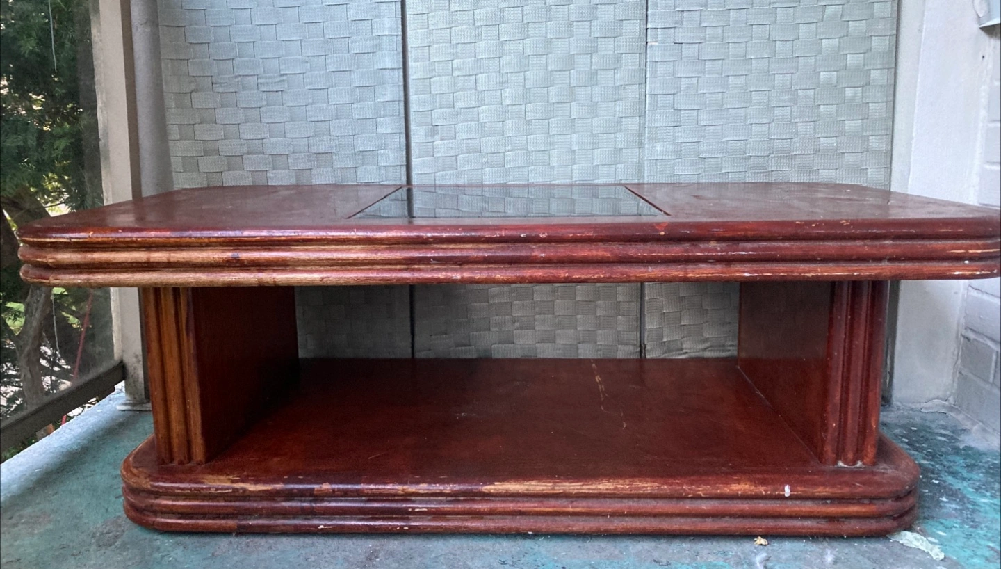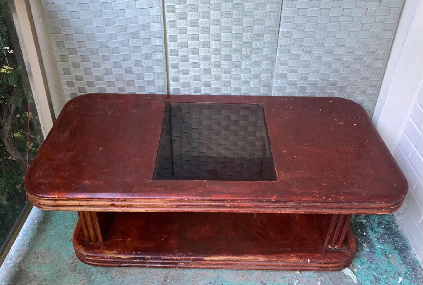 Here's a lovely wooden coffee table that would look great in any living room. It features a glass center and a lower shelf for storage or display. It's in good condition and ready for a new home! Will be painted by request