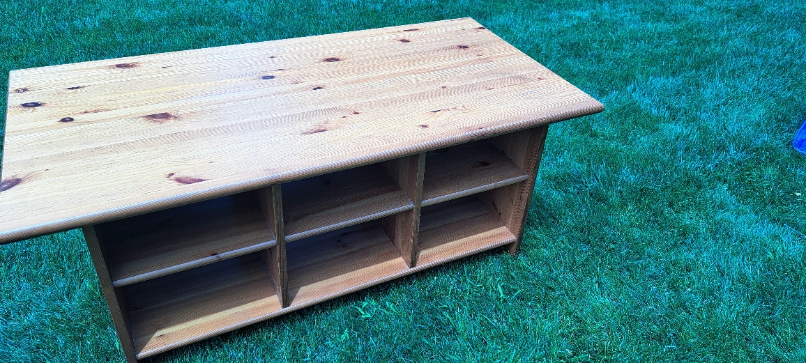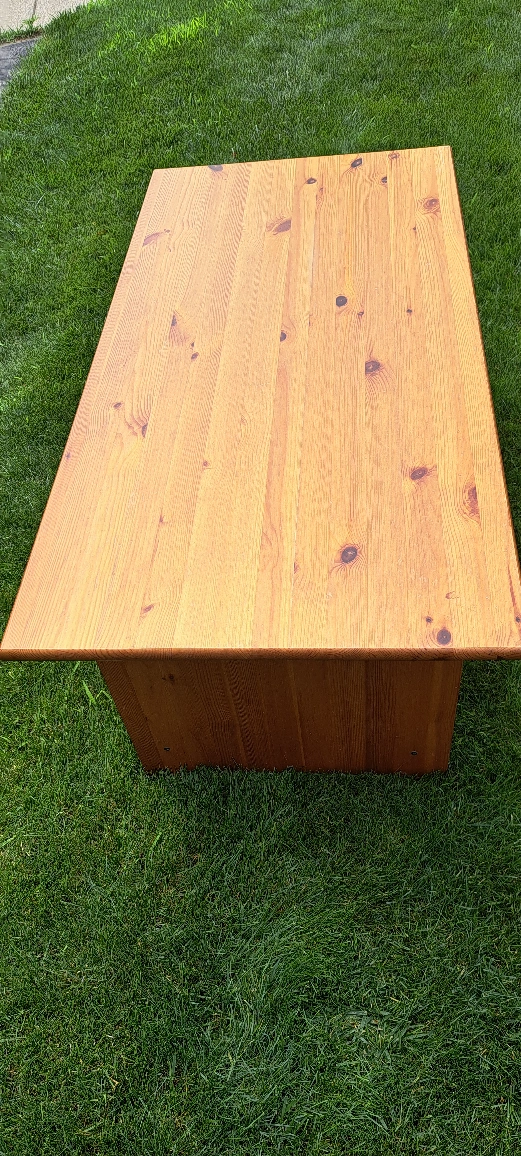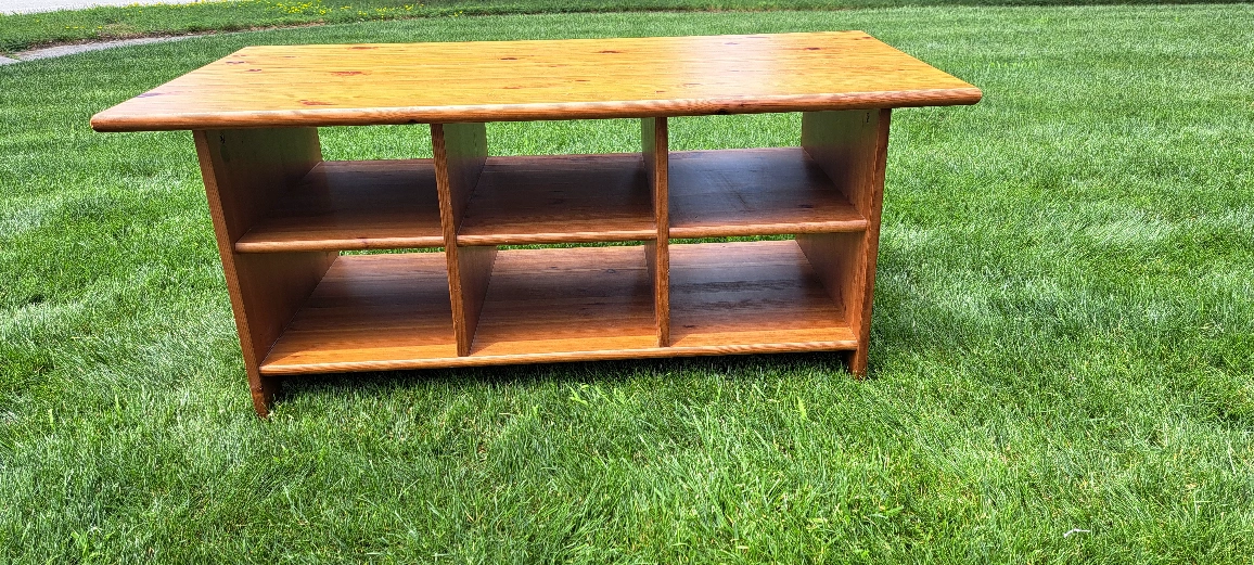A beautiful wooden coffee table with built-in storage shelves! It's in great shape and would be a lovely addition to any living room or den. It offers ample space for books, magazines, or decorative items, keeping your living area tidy and organized