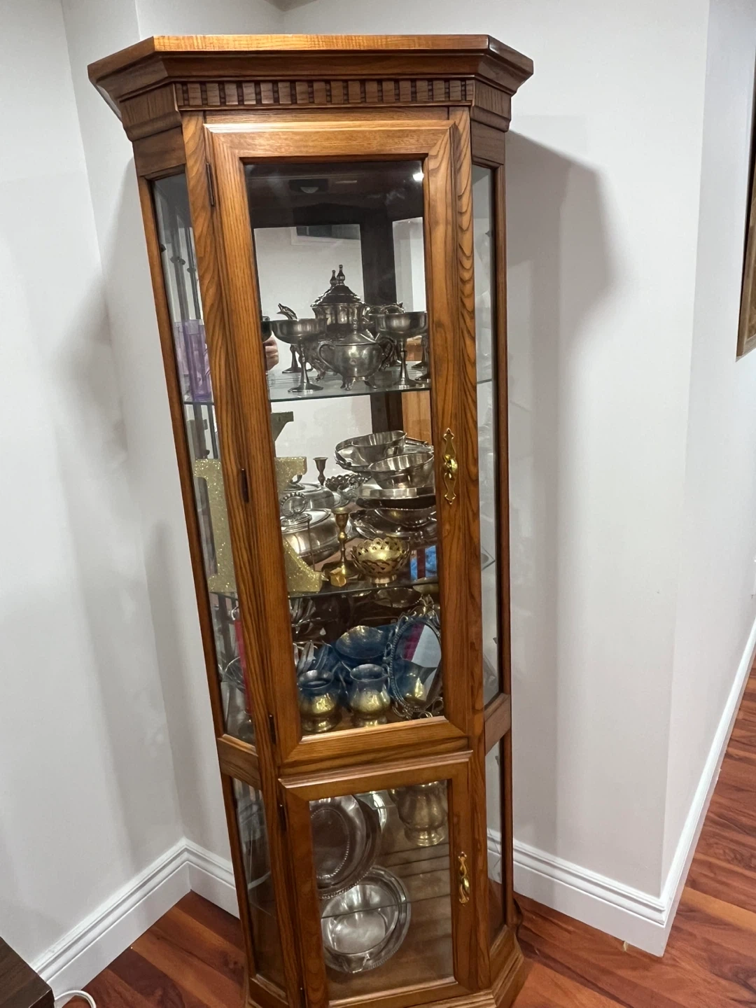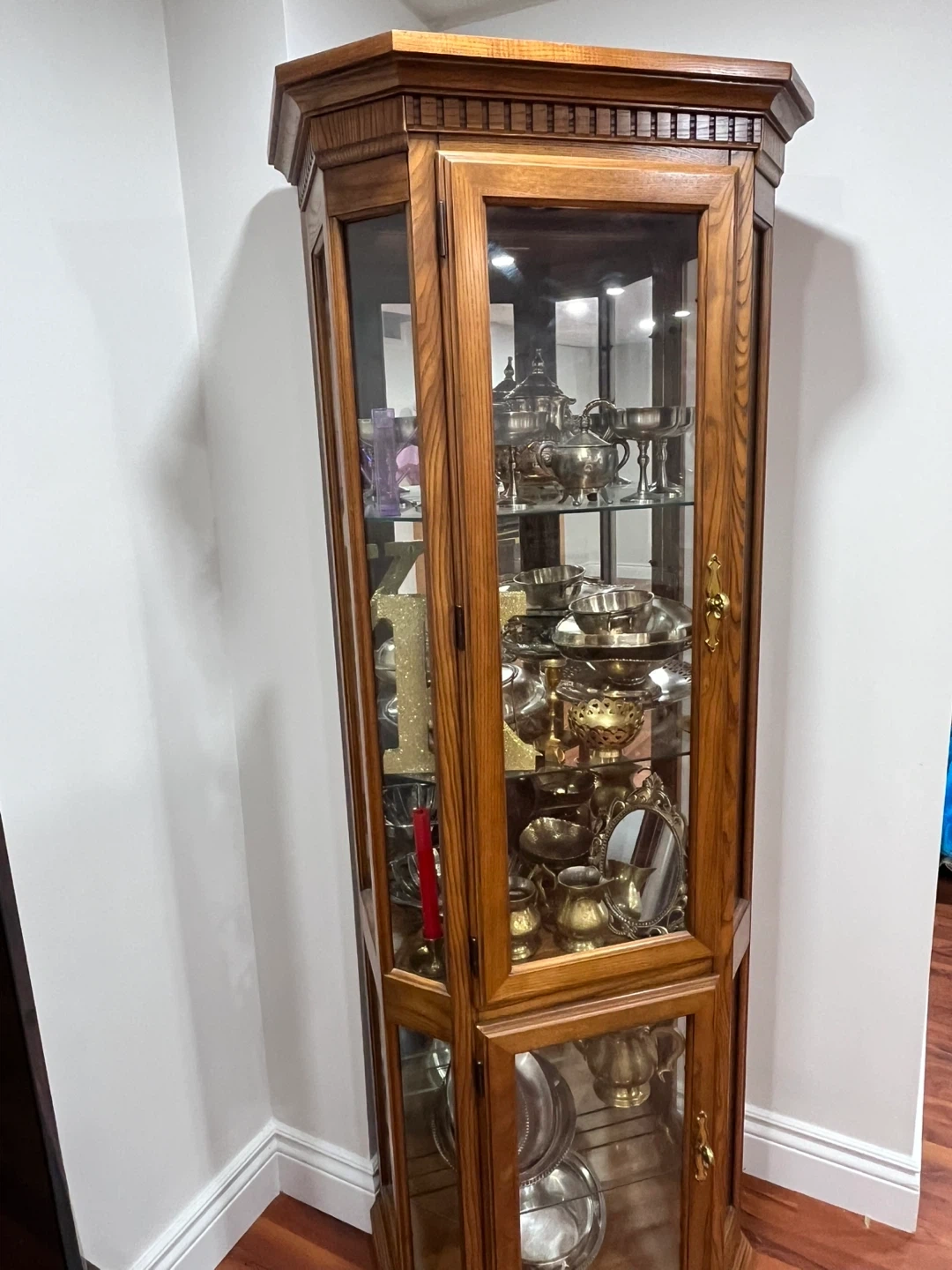 Selling a lovely wooden corner display cabinet with all dishes ! It's perfect for showcasing your favourite items and adding a touch of elegance to any room. The cabinet features glass doors and shelves, allowing for a clear view of the items inside. It's in great condition and ready for a new home