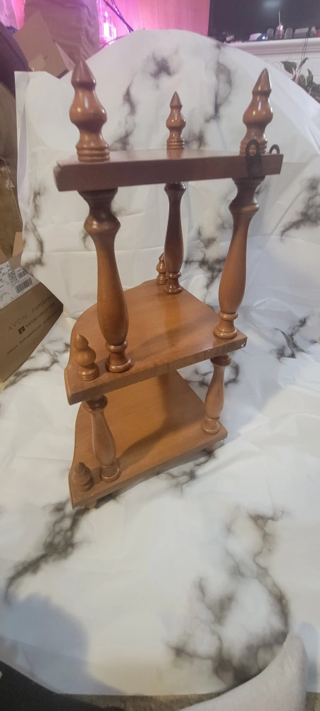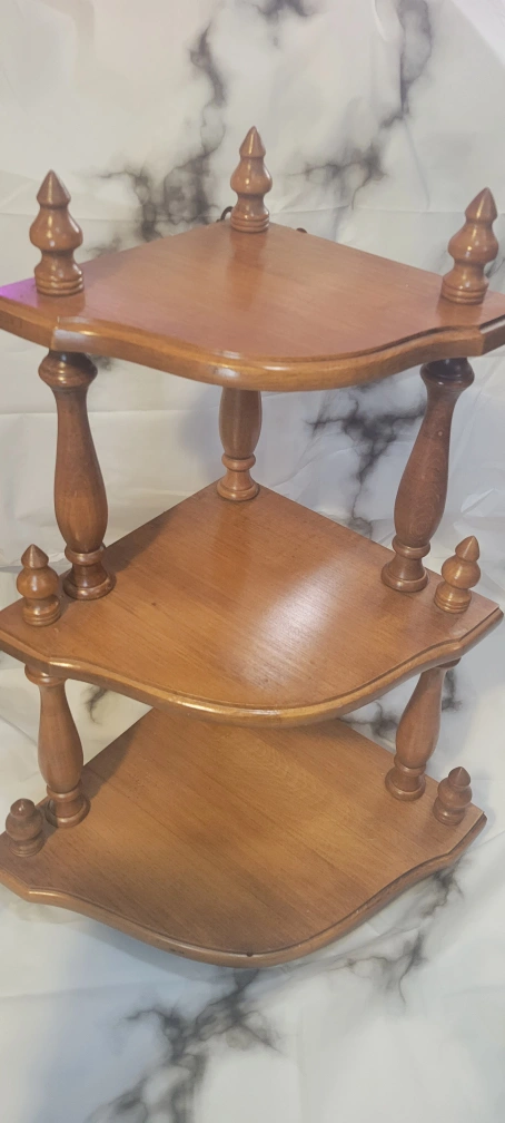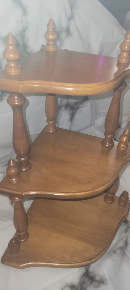 Selling a cute wooden corner shelf! It has two tiers and a nice, warm wood tone. Perfect for adding a touch of charm to any corner of your home. It is in great condition and ready for a new home!