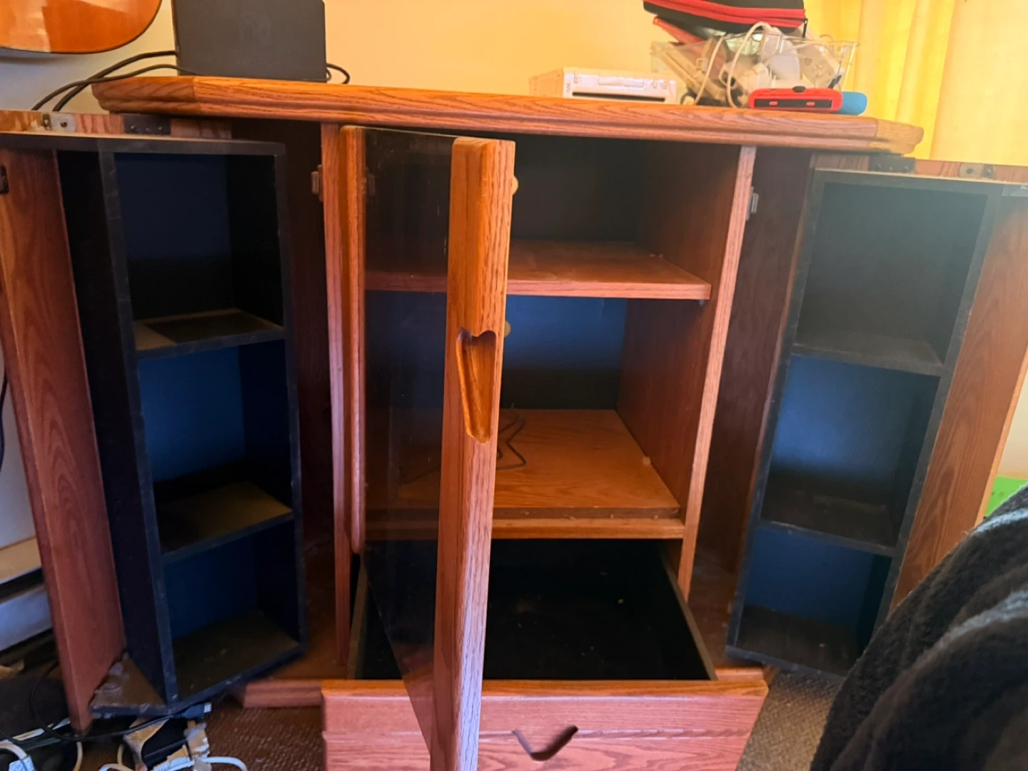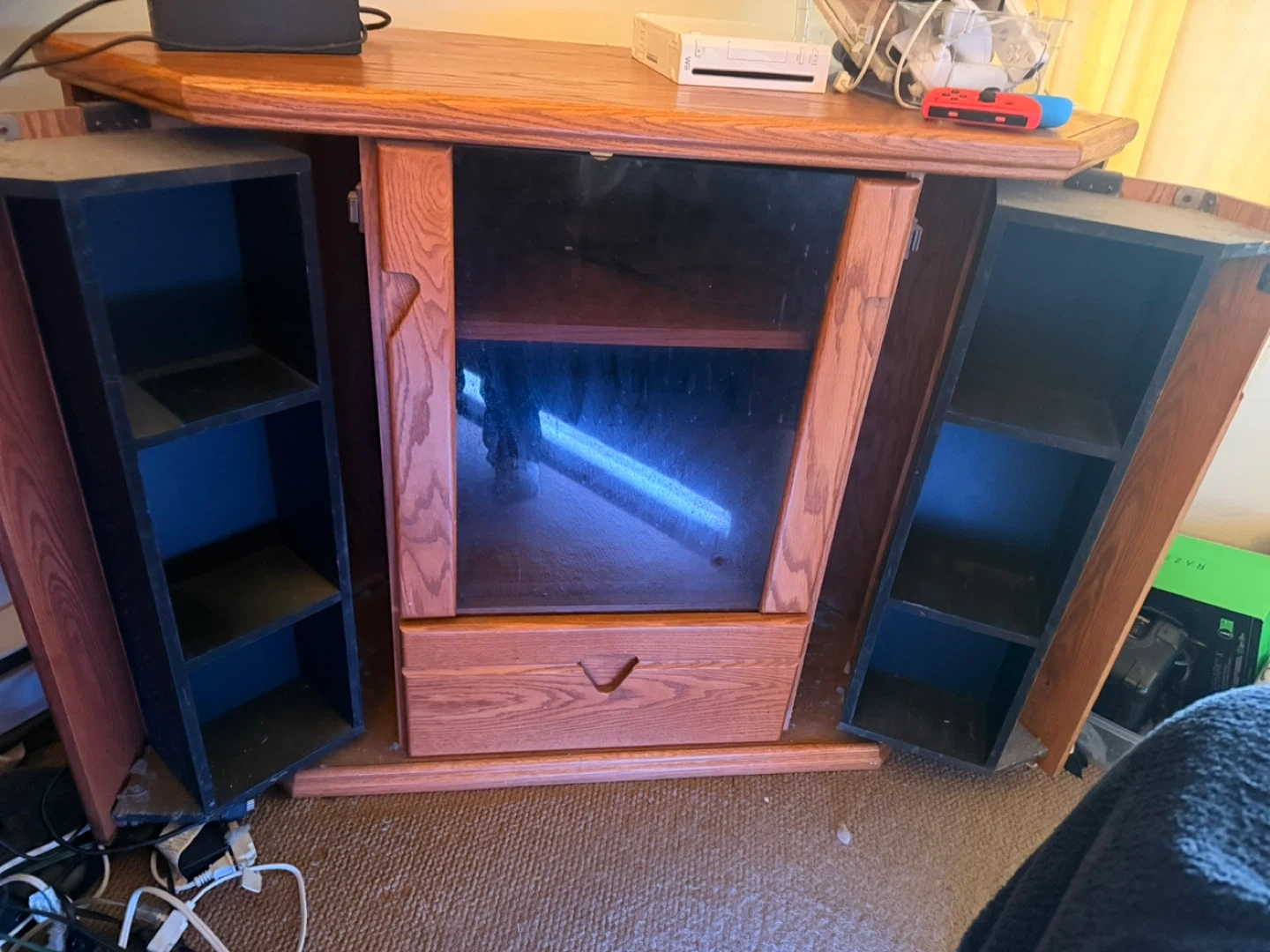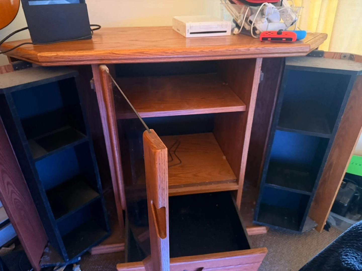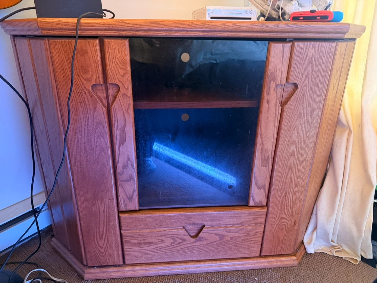 Corner TV/ Media unit with two opening side doors to keep DVDs organized . In the middle there’s two shelves behind a glass door. Bottom has a drawer . Solid wood, well made used but in great shape.