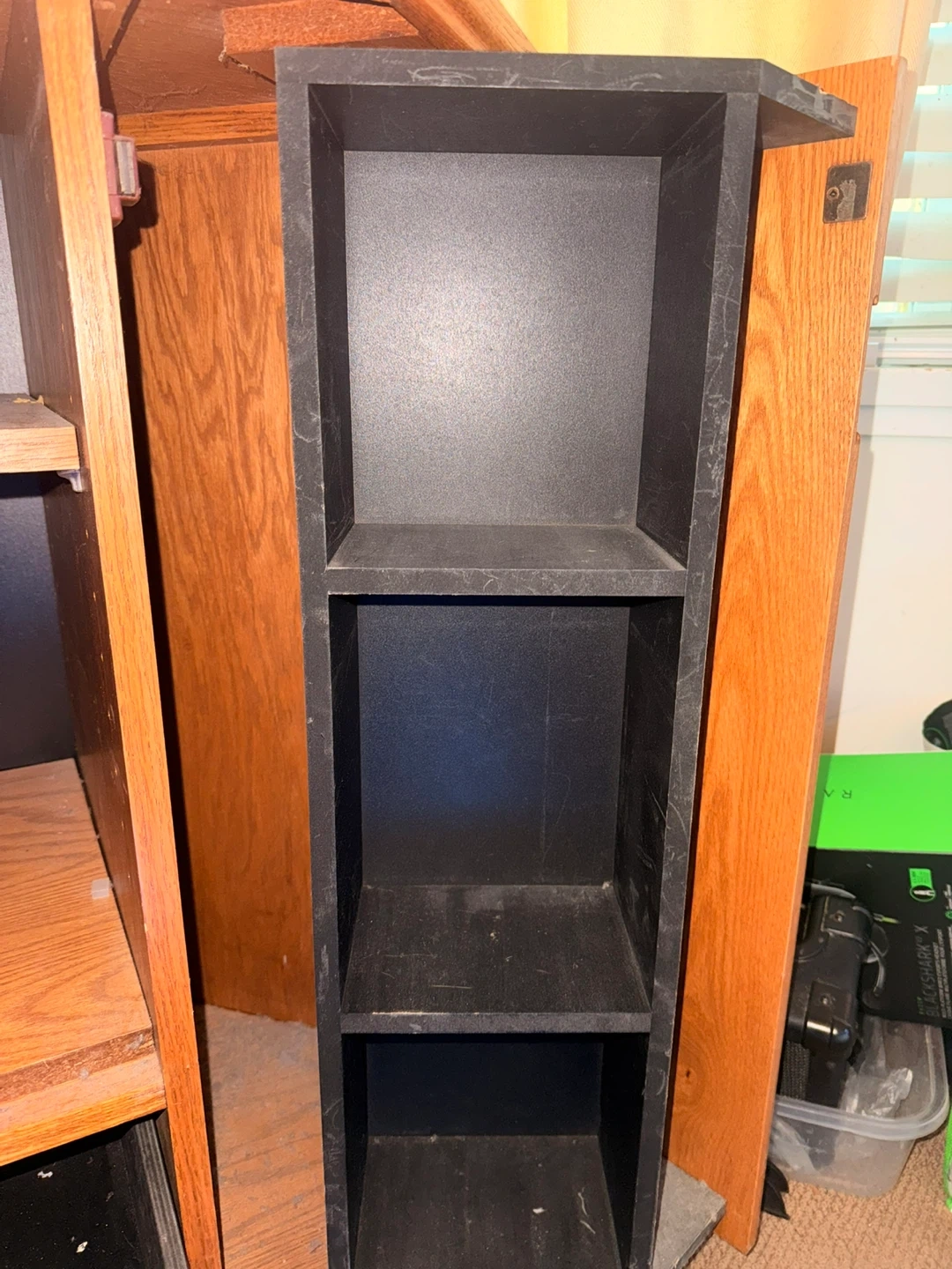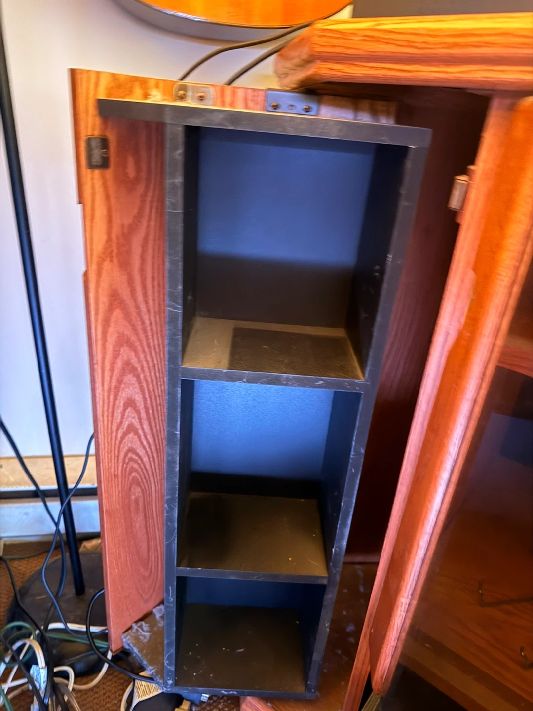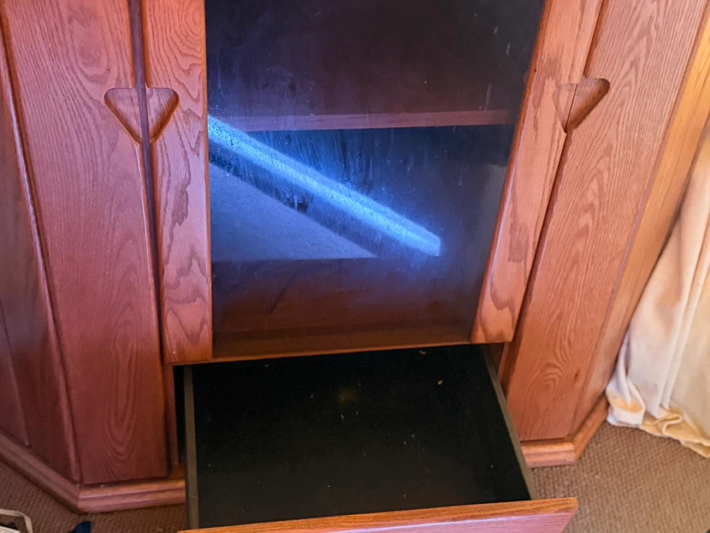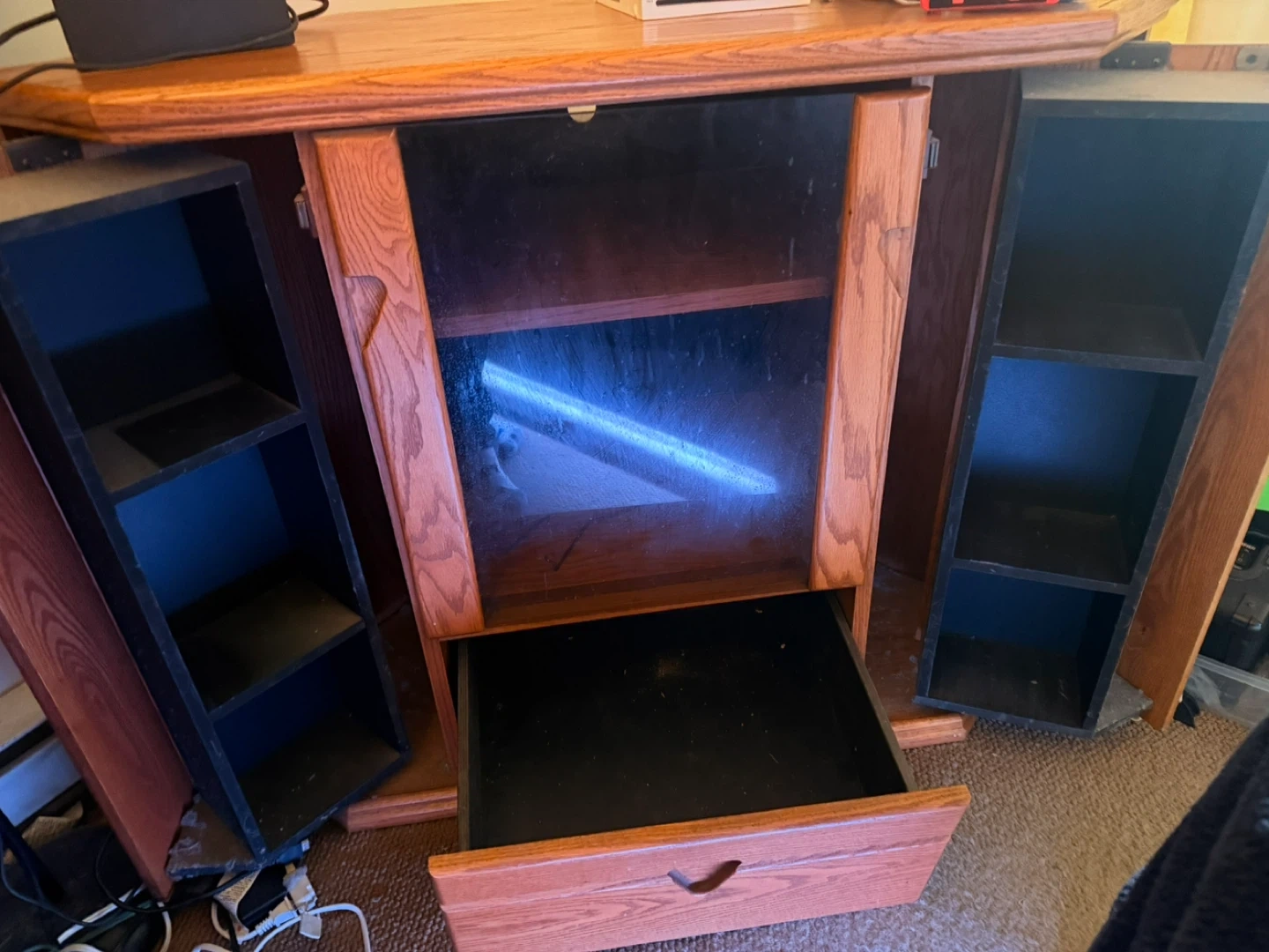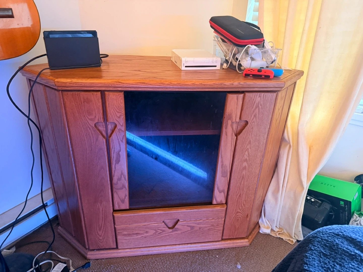 Corner TV/ Media unit with two opening side doors to keep DVDs organized . In the middle there’s two shelves behind a glass door. Bottom has a drawer . Solid wood, well made used but in great shape.