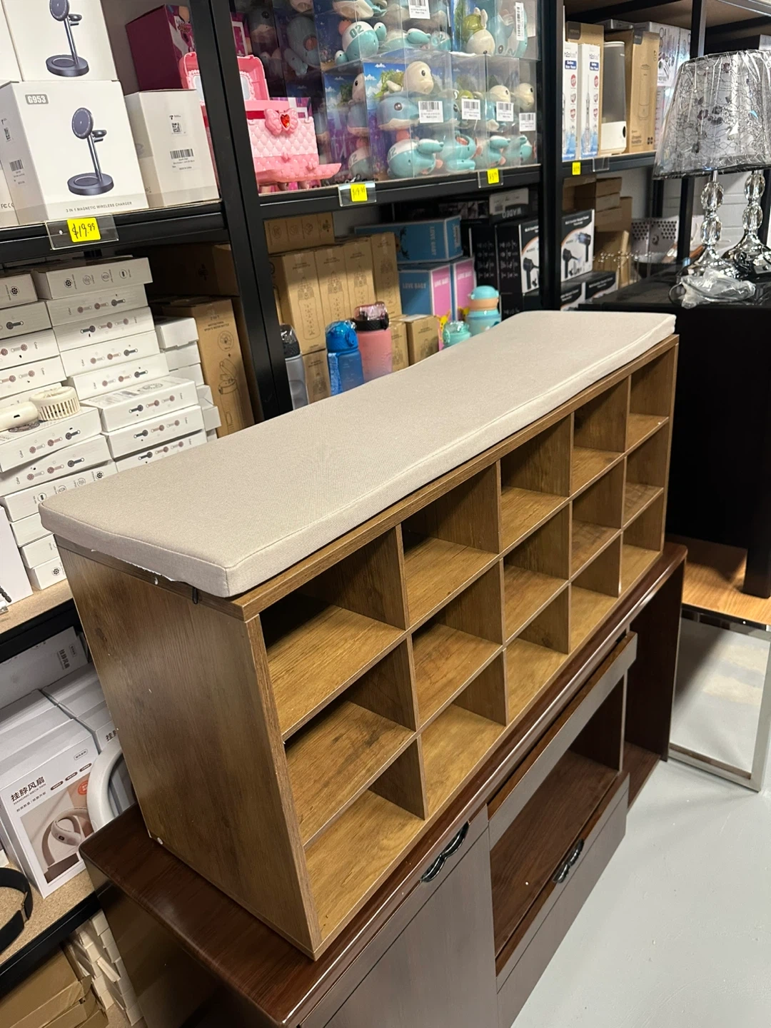 Looking to organize your entryway or mudroom? This wooden cubby bench is perfect! It features individual cubbies for shoes or other items, and a comfy cushion on top for sitting. It's in great shape and ready for a new home