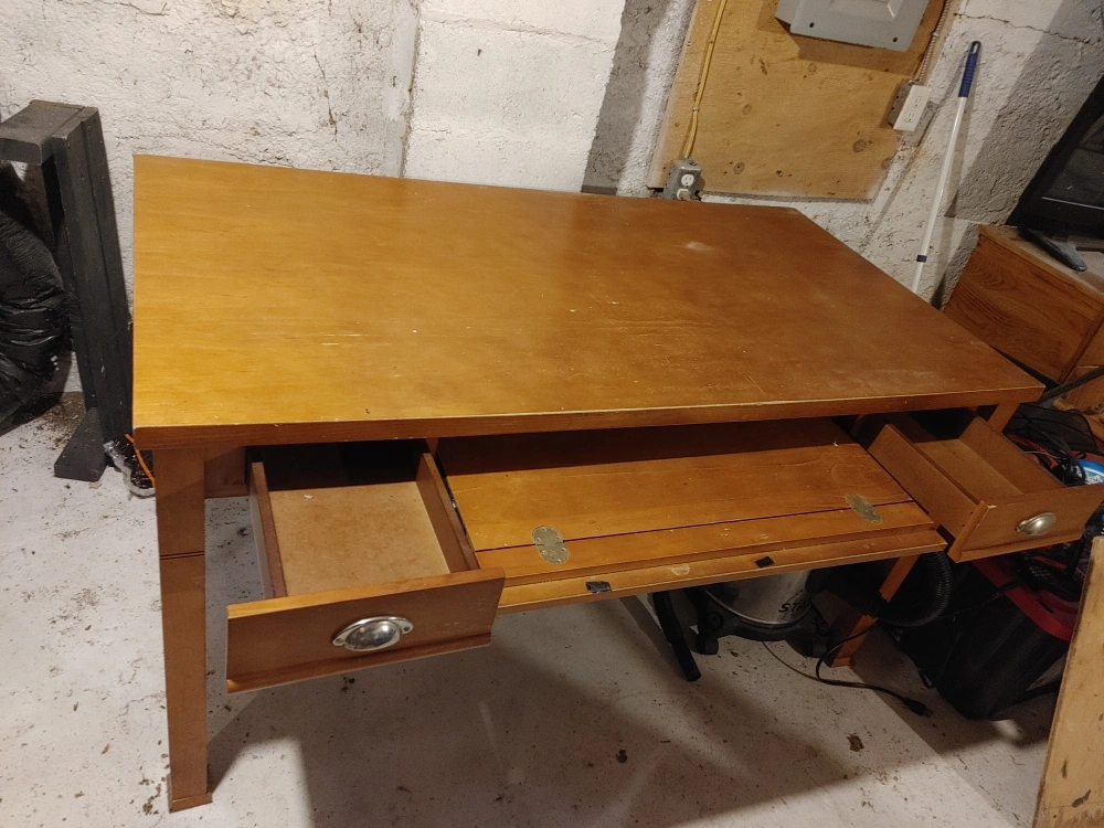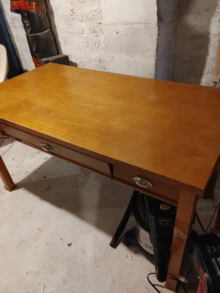 A classic wooden desk with a warm, honey-toned finish. It features two drawers, perfect for storing stationery or other essentials. This desk is sturdy and ready to be a great addition to your home office or study space