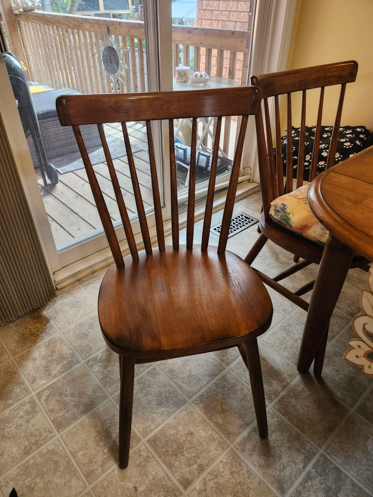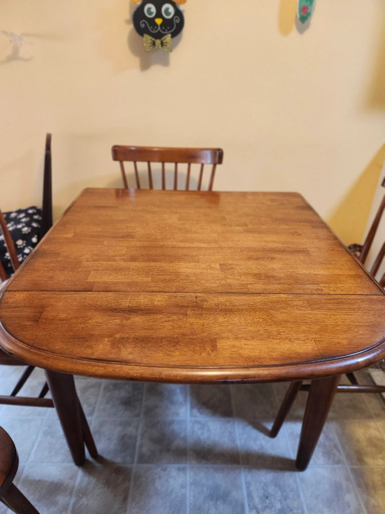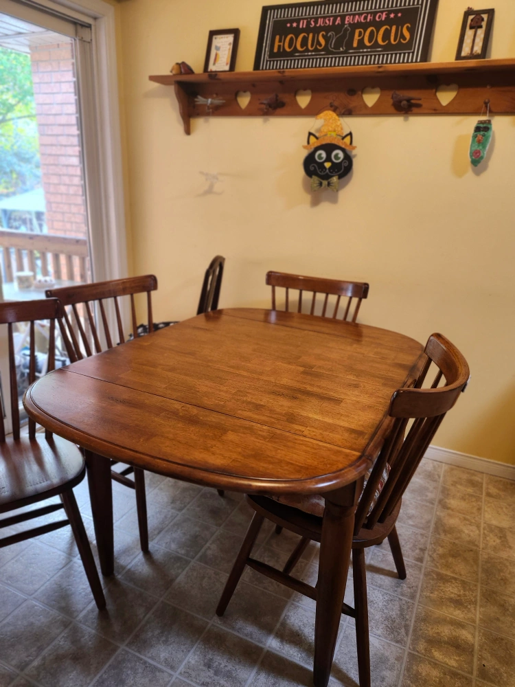 Selling a lovely wooden dining table with four matching chairs. It's in good condition and would be a great addition to any kitchen or dining room. The set features a classic design with a warm wood finish. Two drop leafs makes it go from 30" to up to 48" with both up. 36"wide.