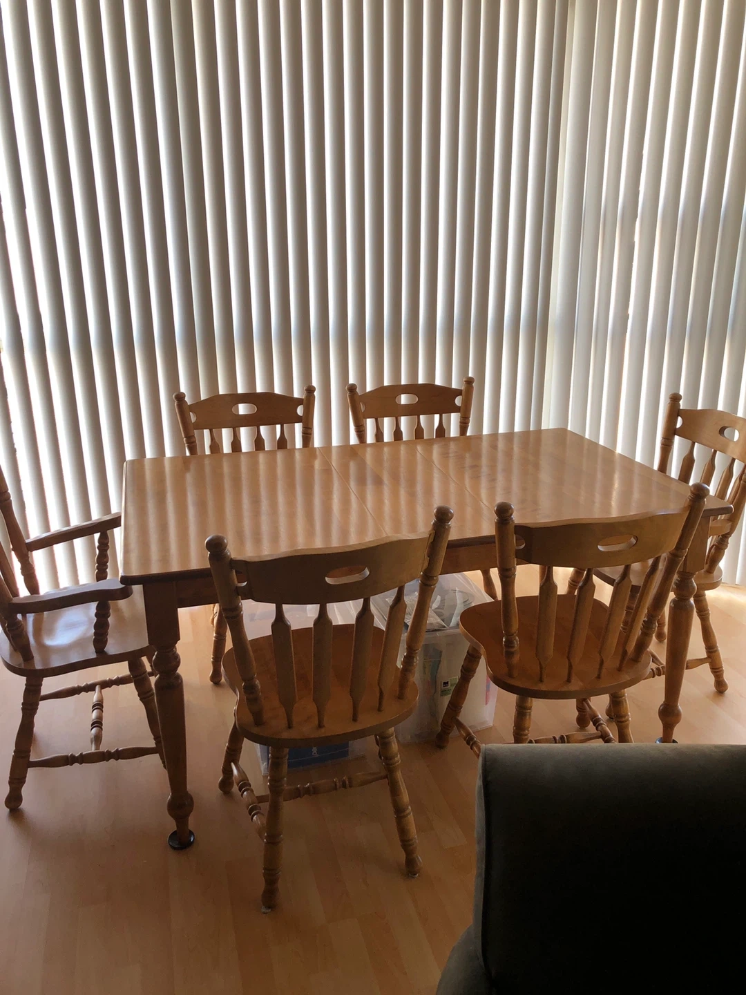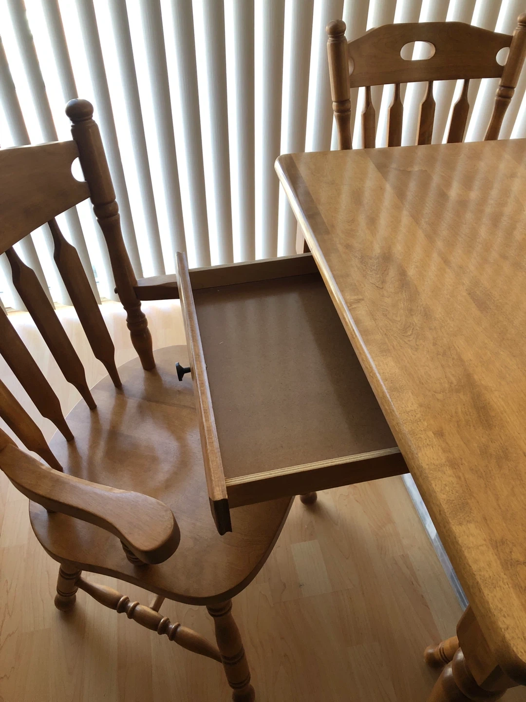Birch Set - Selling a lovely wooden dining table set that includes six chairs. The table has a classic design and a warm, inviting colour that would fit well in any dining room or kitchen. It also features a handy drawers built into both sides. The 6 chairs are sturdy and comfortable, making this set perfect for family meals or gatherings with friends. Centre piece / Leaf of 12” can be easily removed. ***CAN BE BOUGHT WITH MATCHING HUTCH - make us an offer ***