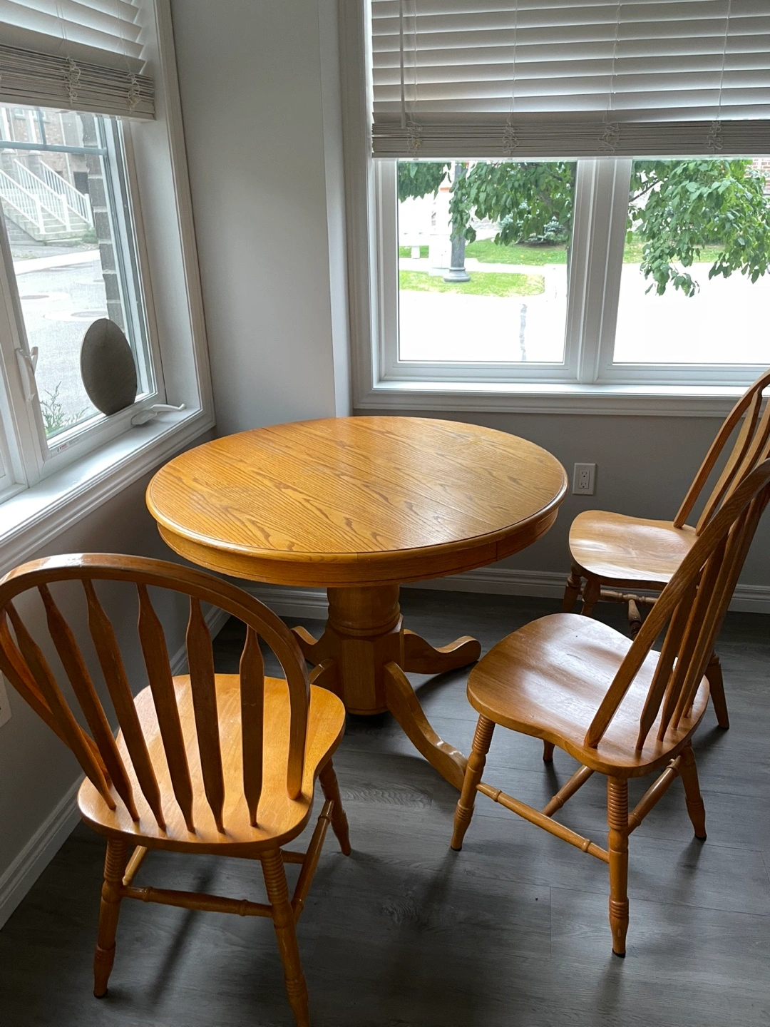 Selling a wooden dining table with six matching chairs! The set is in good condition and would be a great addition to any dining room or kitchen. The table is round and can be expanded. The chairs have a classic, timeless design Pick up at Ancaster, Hamilton