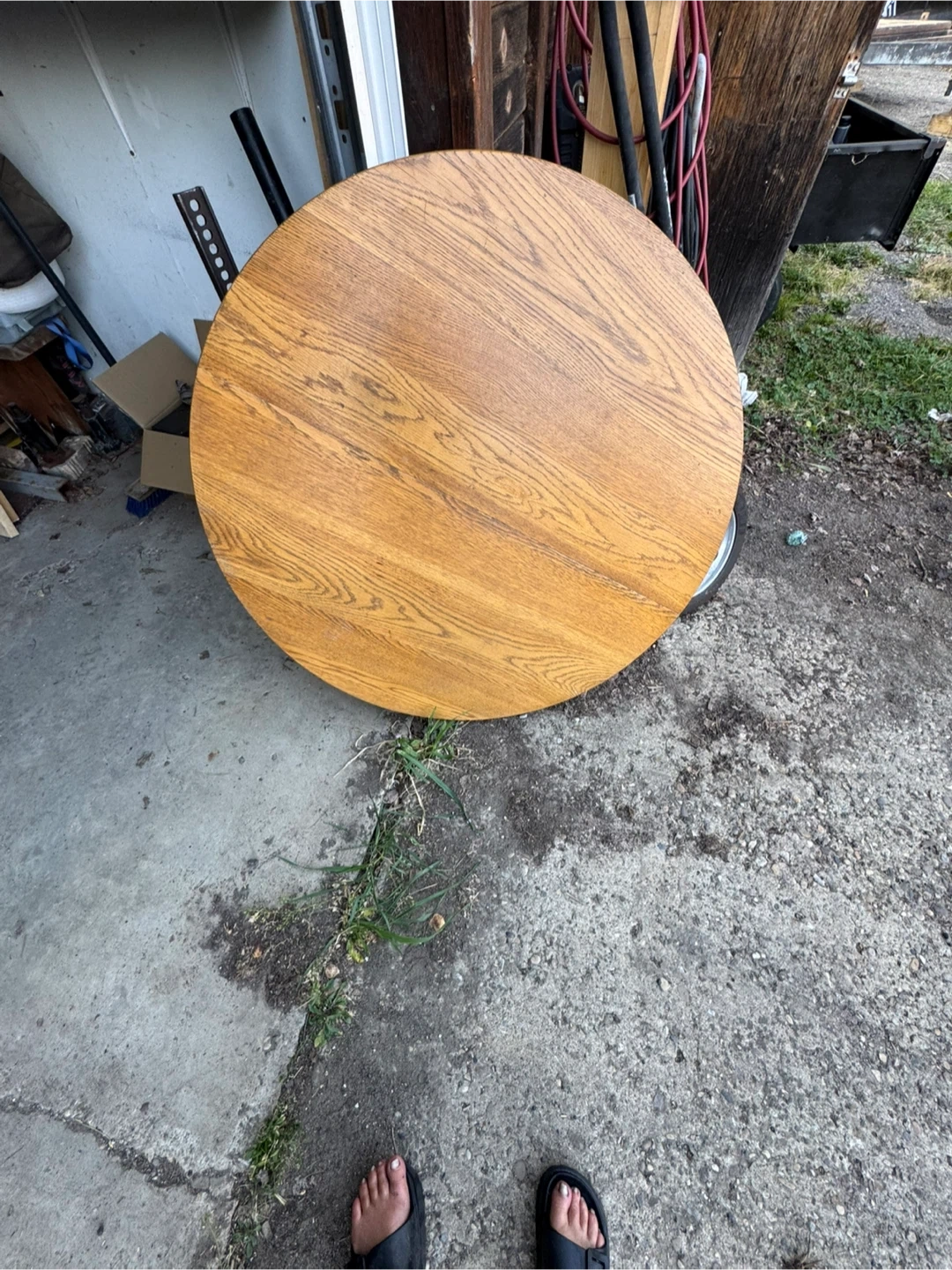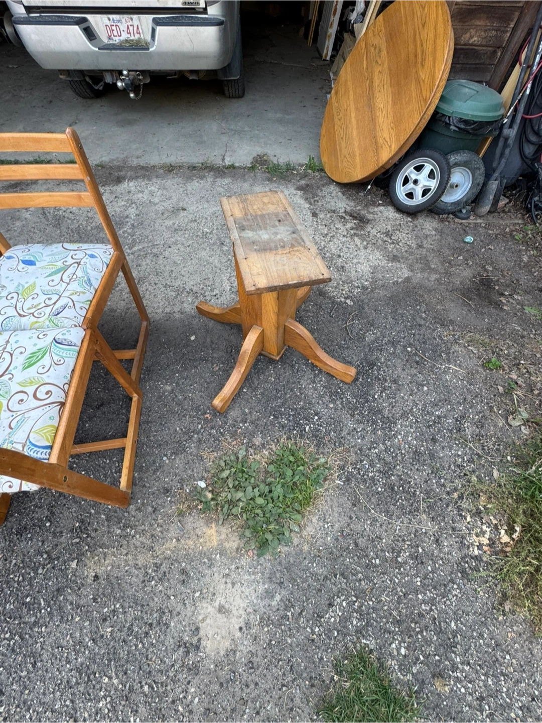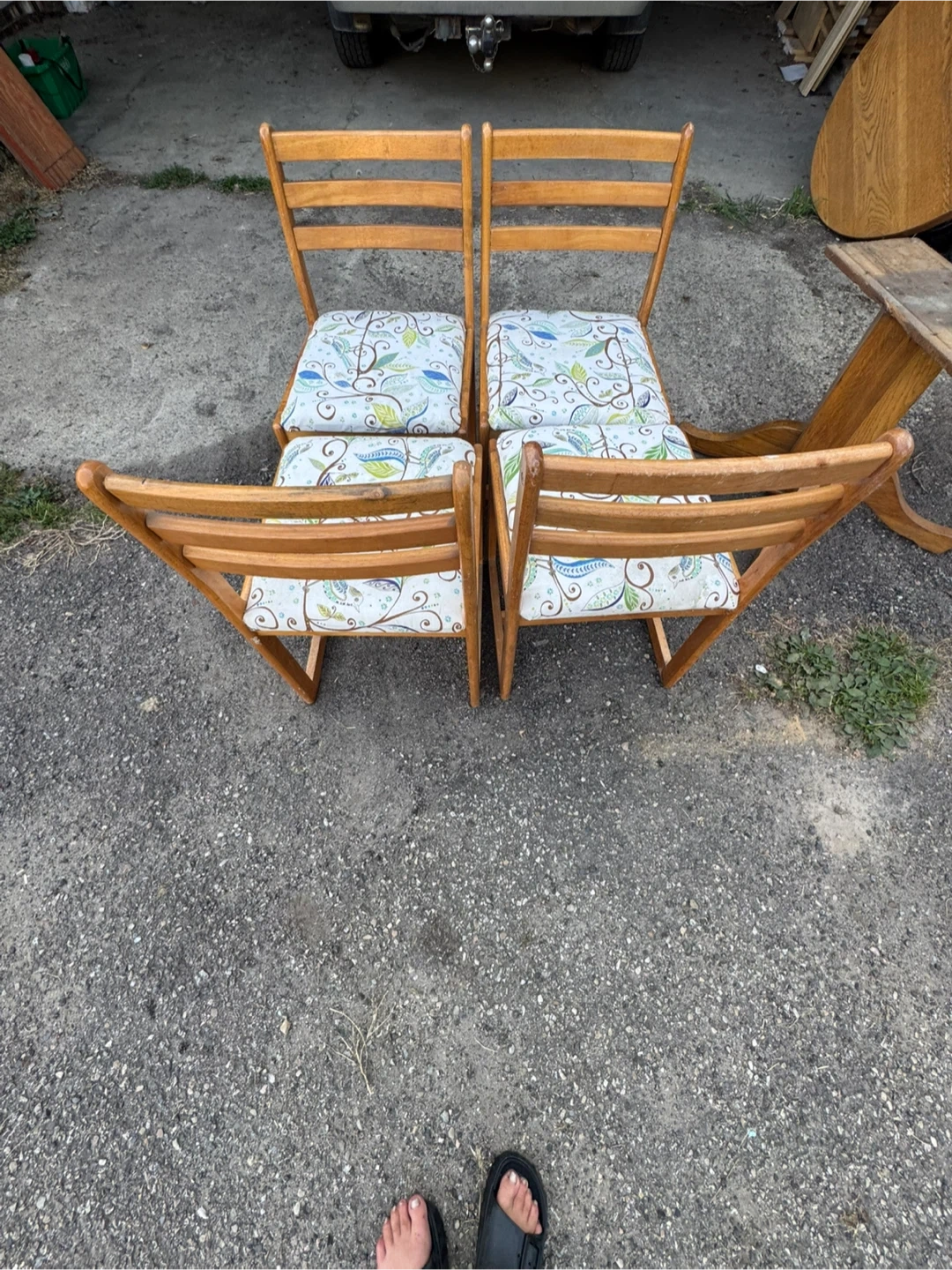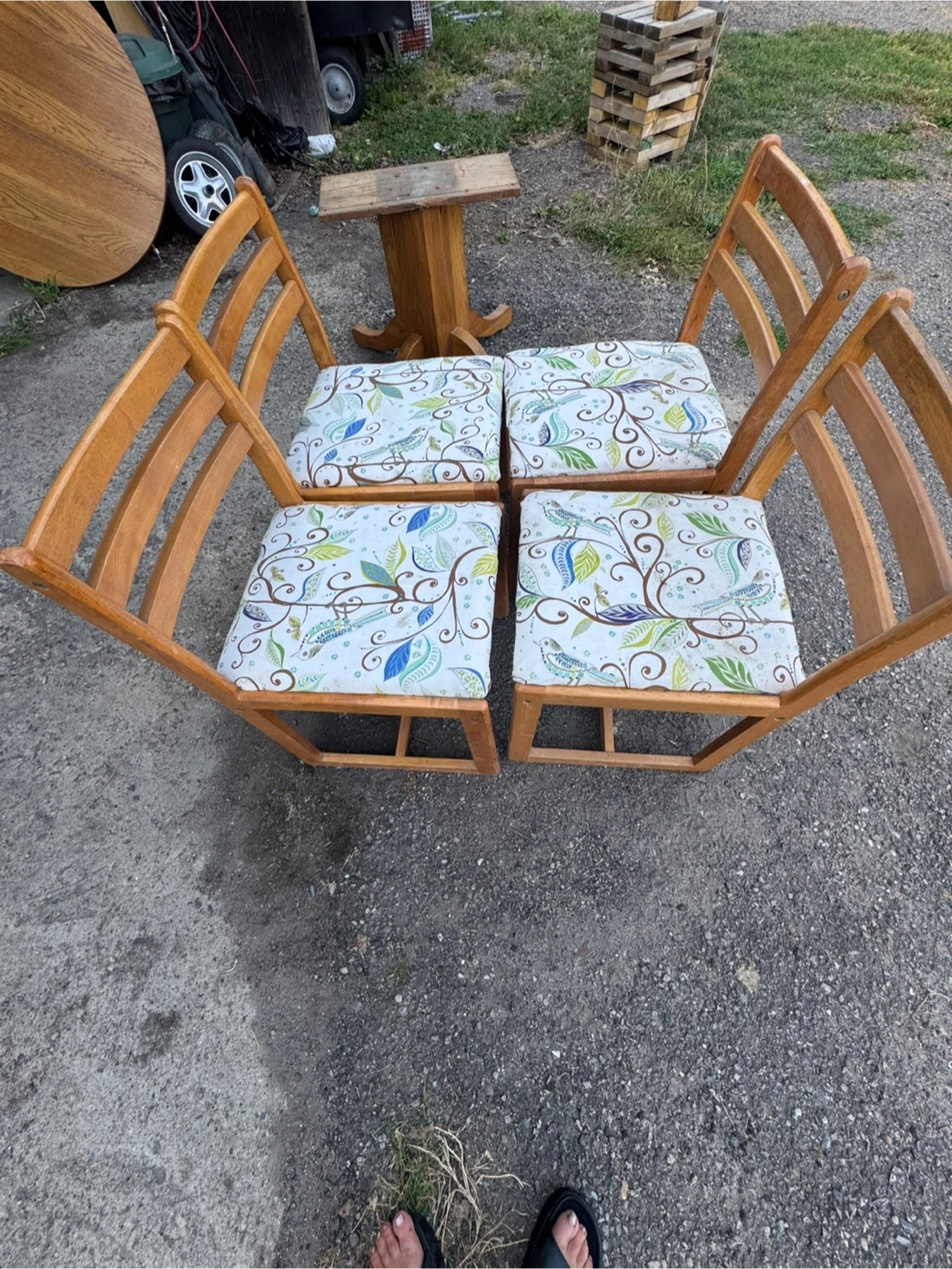 Selling a wooden dining table along with four matching chairs. The chairs have patterned cushions for added comfort and style. The table and chairs are in good condition and ready to be used in your dining room or kitchen. Perfect for family meals or gatherings with friends!