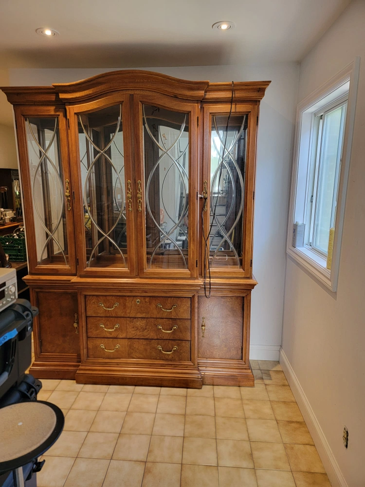 Selling a wooden display cabinet, perfect for showcasing your favourite items! It features glass doors on top and drawers and cabinets on the bottom for storage. It's in good condition and ready for a new home