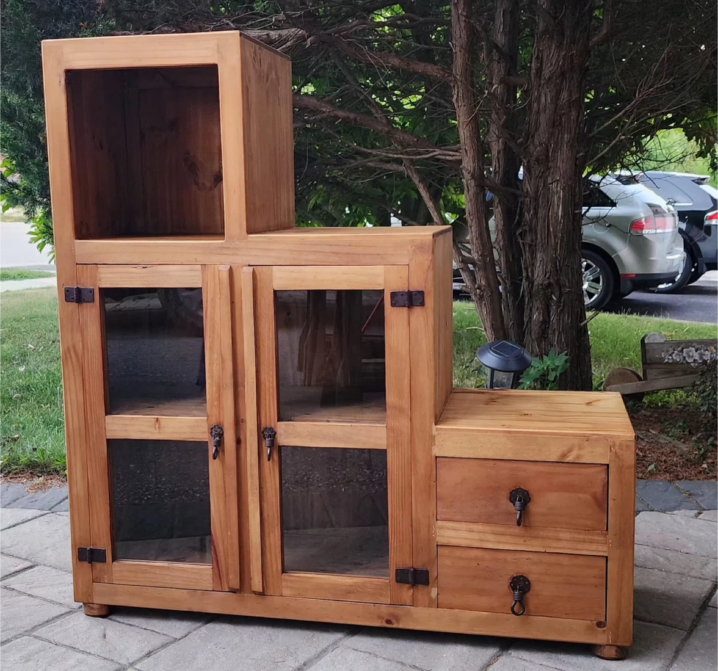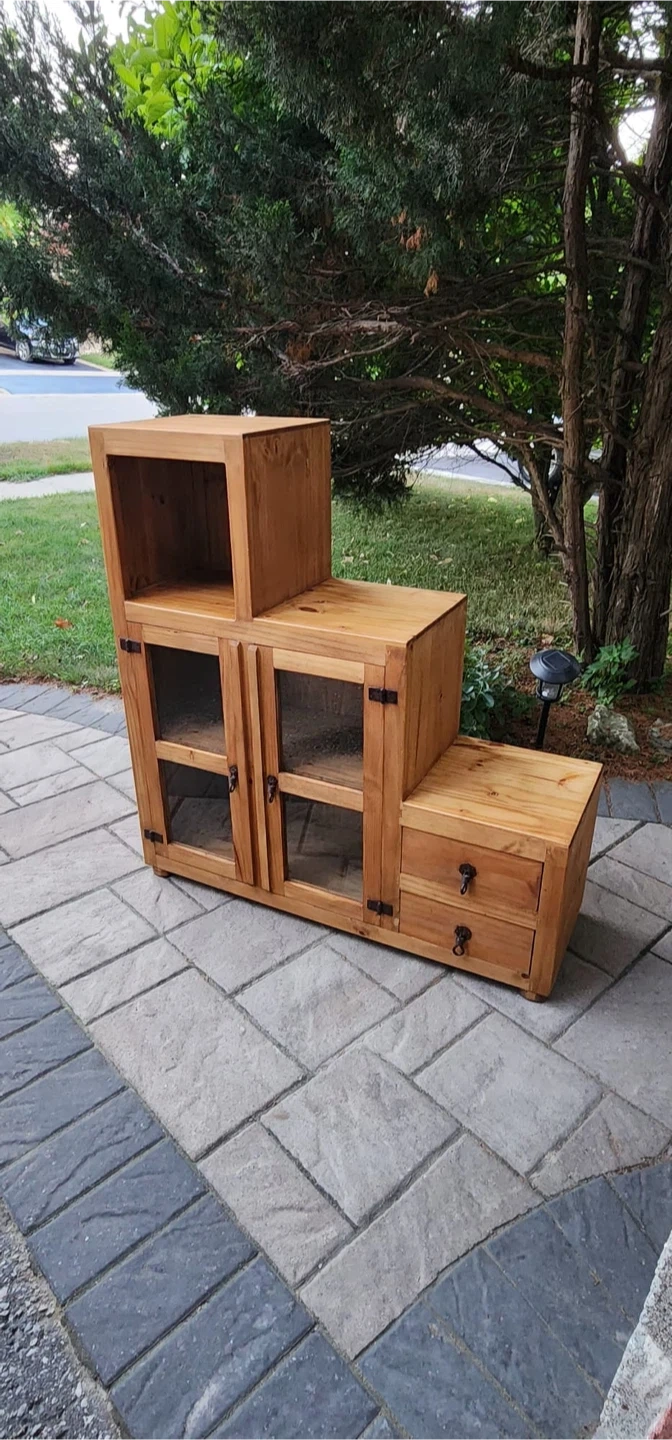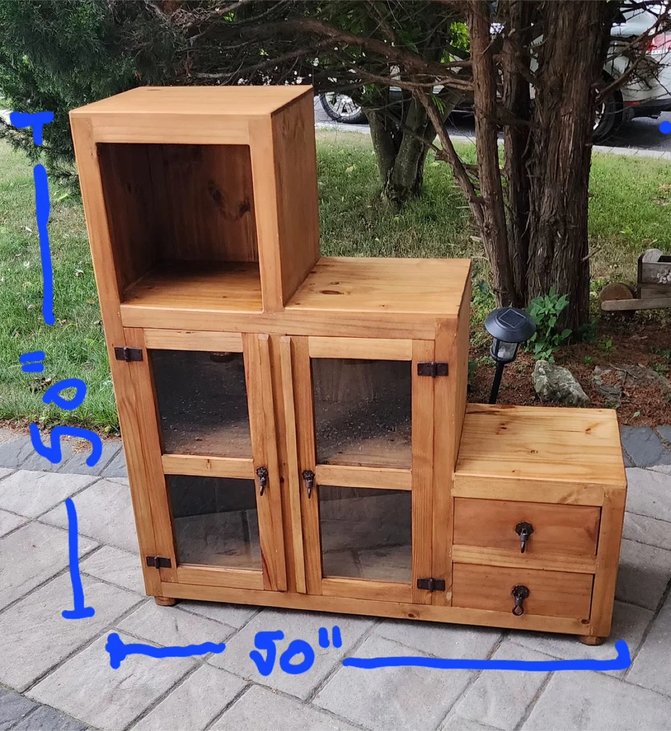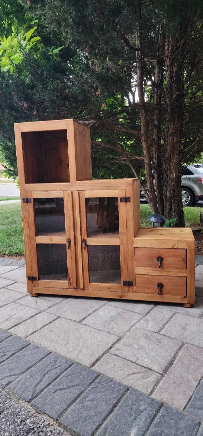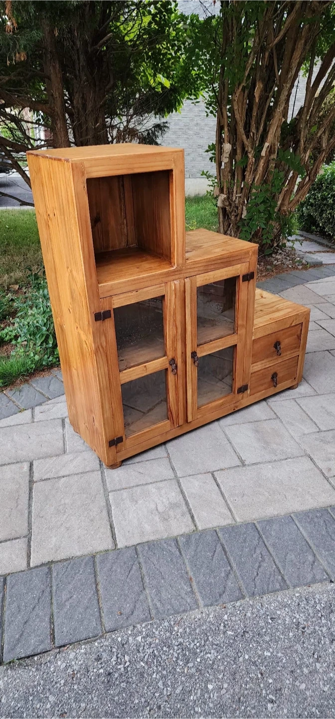 Selling a unique wooden display cabinet! It features glass doors, drawers, and an open shelf on top. It's a great piece to showcase your favourite items or add some extra storage to your home. Dimensions are approximately 50" tall and 50" wide.
