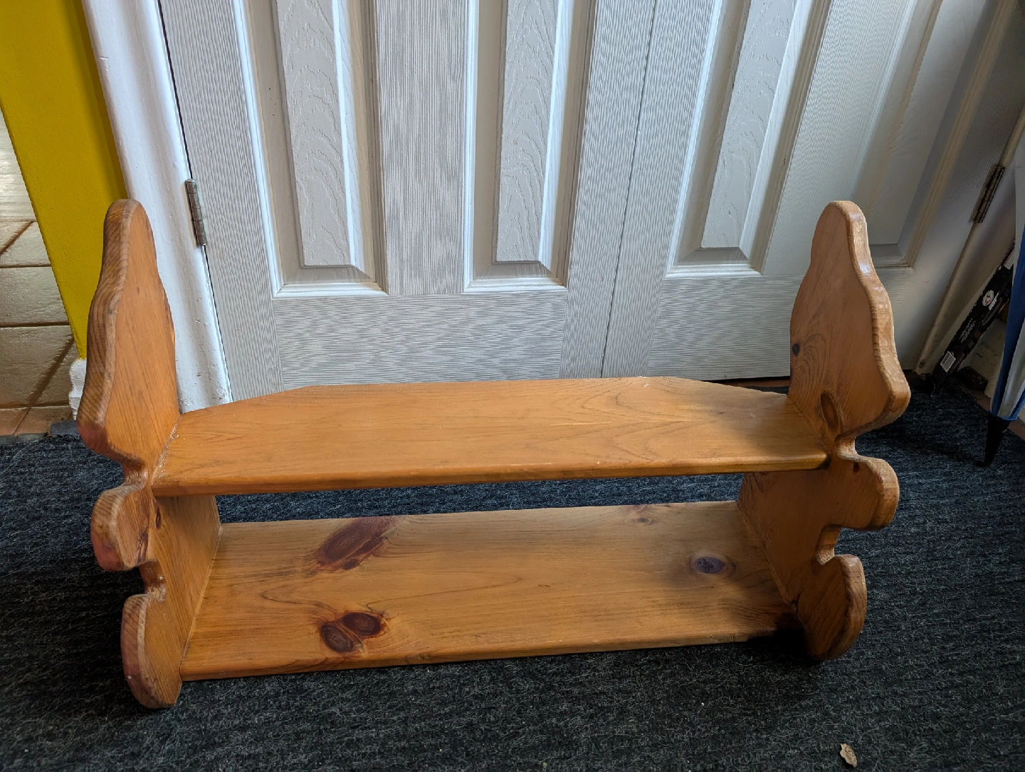Here's a cute wooden shelf! It has two shelves and a unique design on the sides. It's in good condition and ready for a new home
