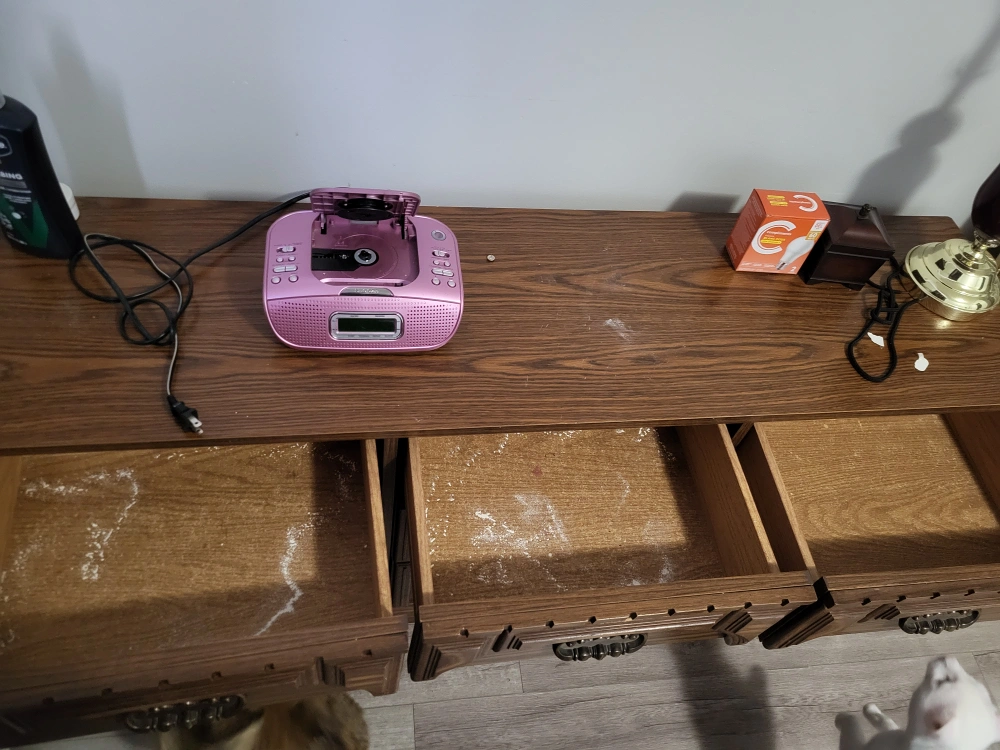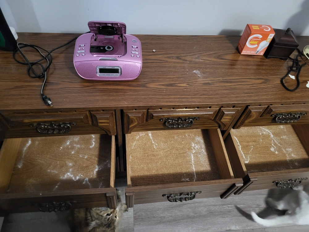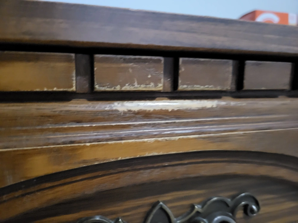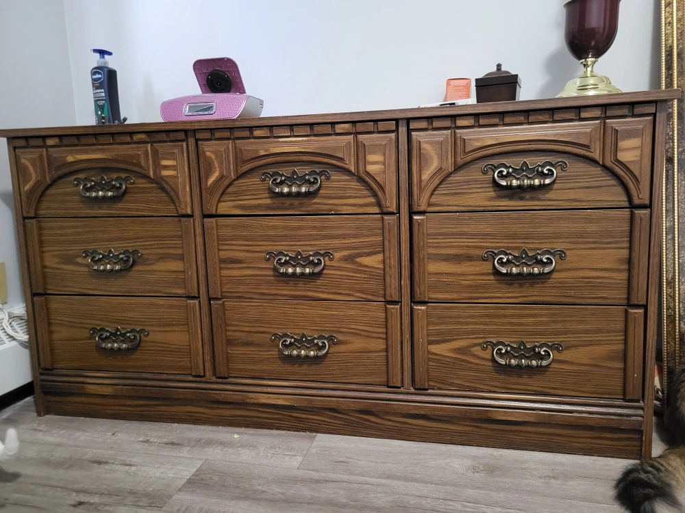 Selling a wooden dresser with nine drawers. It has a traditional design with ornate handles. There are some signs of wear and tear, but it's still a functional piece of furniture for your bedroom or living space. Unsure of the exact size, though it is fairly large. (Hasn't been used for 3 months) Pick-up only.