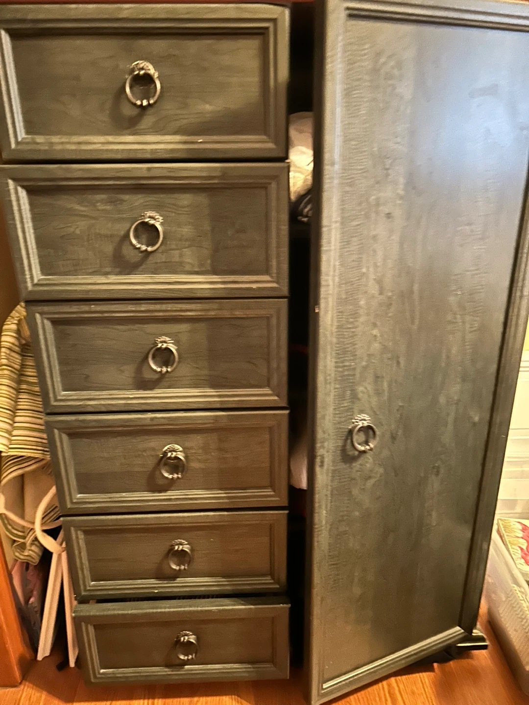 Here's a lovely wooden dresser with several drawers. It's a great piece for adding storage to any room. The dresser features unique ring-style handles on each drawer and a cabinet door on the side. It has a beautiful, slightly distressed finish that adds character to the piece. Scratches on top.