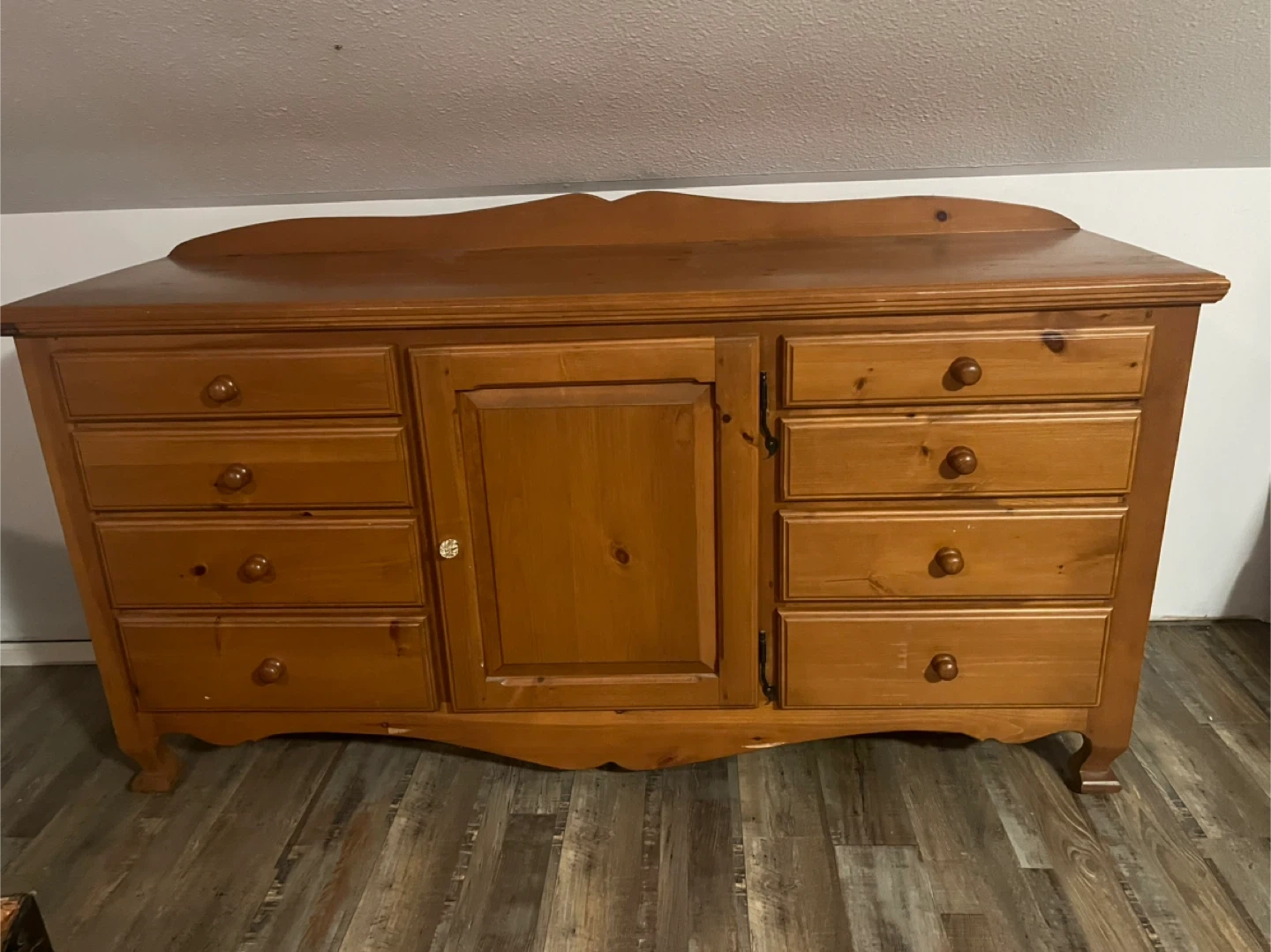 This is a wooden dresser with several drawers and a cabinet. It's a great piece for adding storage to any room! Was made with solid pine by hand by an artisan from Quebec.