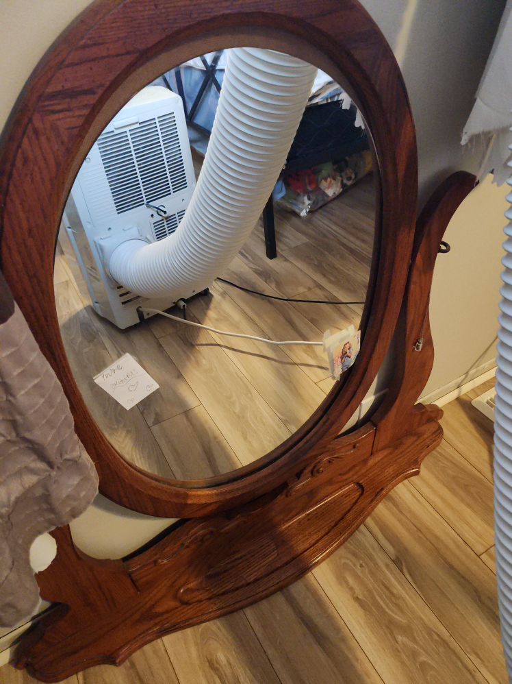lovely oval mirror with a wooden frame. It has a beautiful, classic design that would look great in any room. The wood has a nice warm tone. It's in great shape and ready to find a new home! must pick up