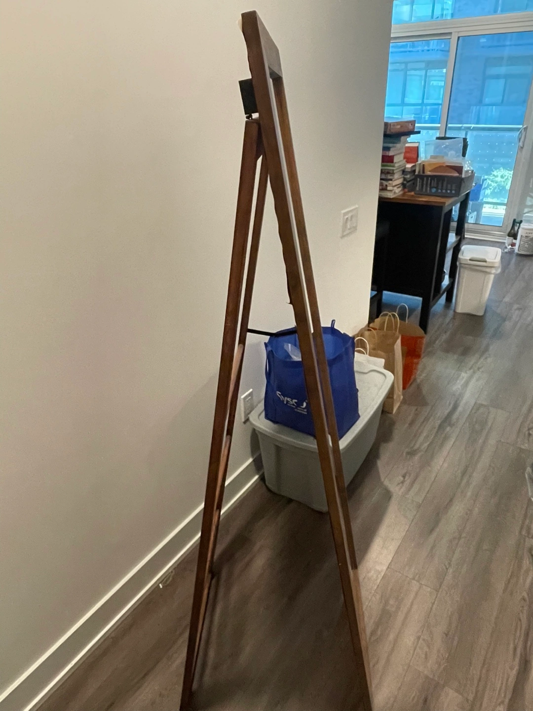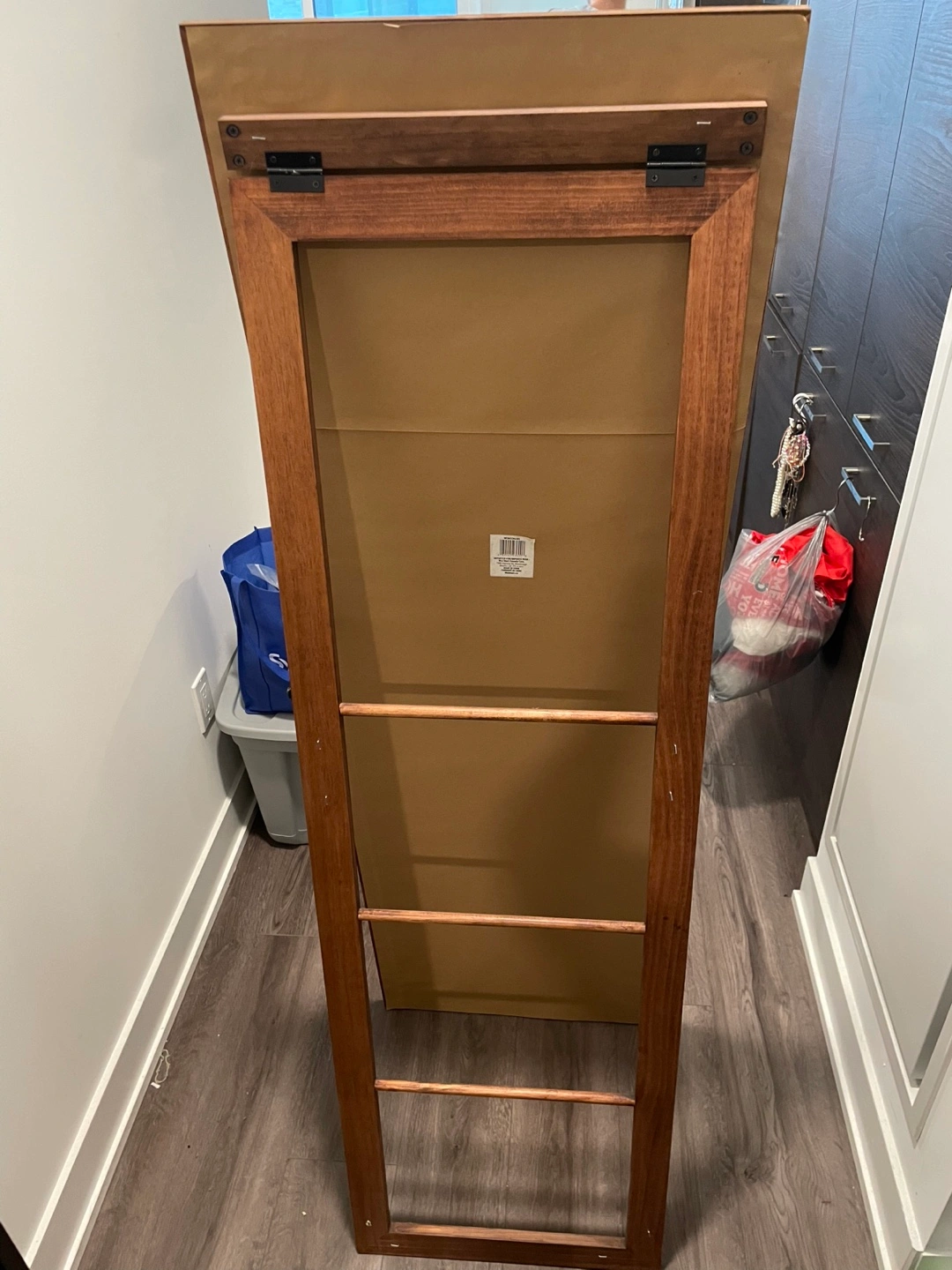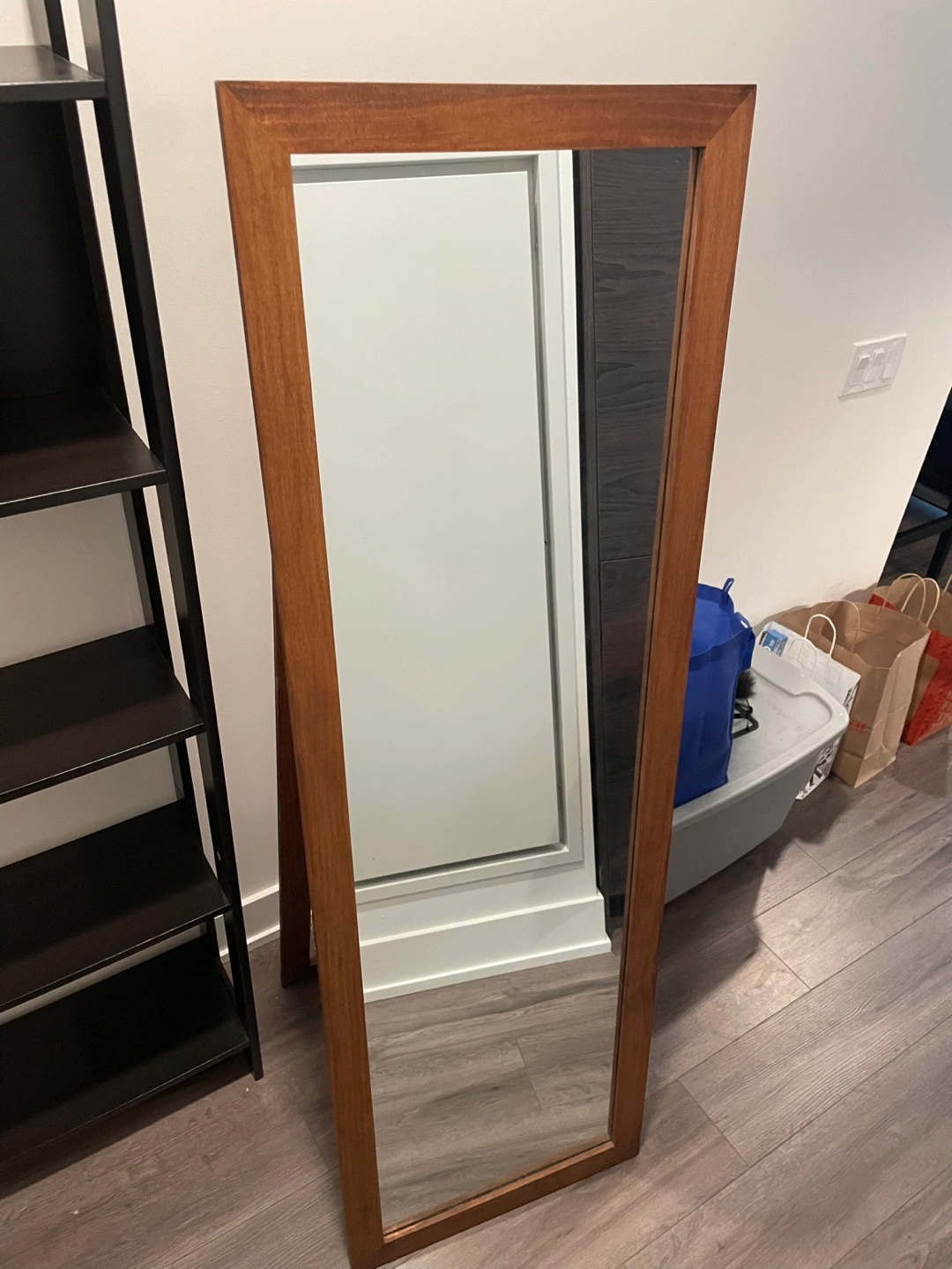 Selling a lovely standing mirror with a wooden frame! It's in great condition and would look perfect in any room. The frame has a warm, natural wood tone that adds a touch of elegance to your space. Also you can set angle of mirror as you want. For delivery, depends on distance we can delievery it to you with extra fee.