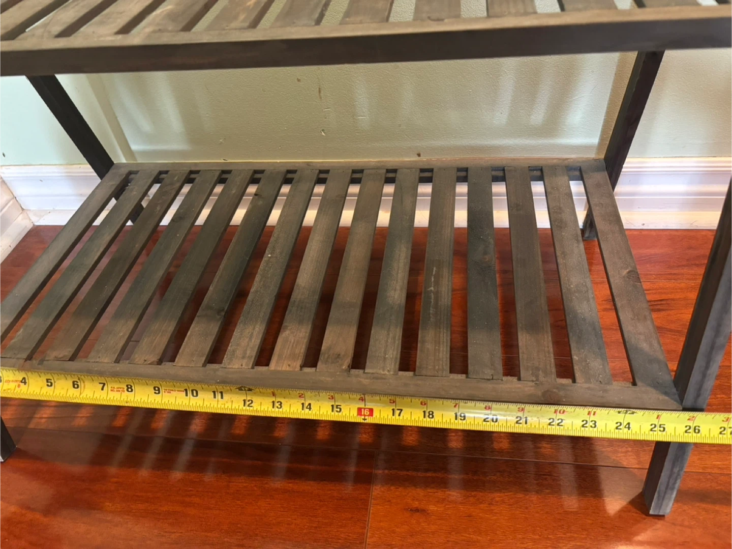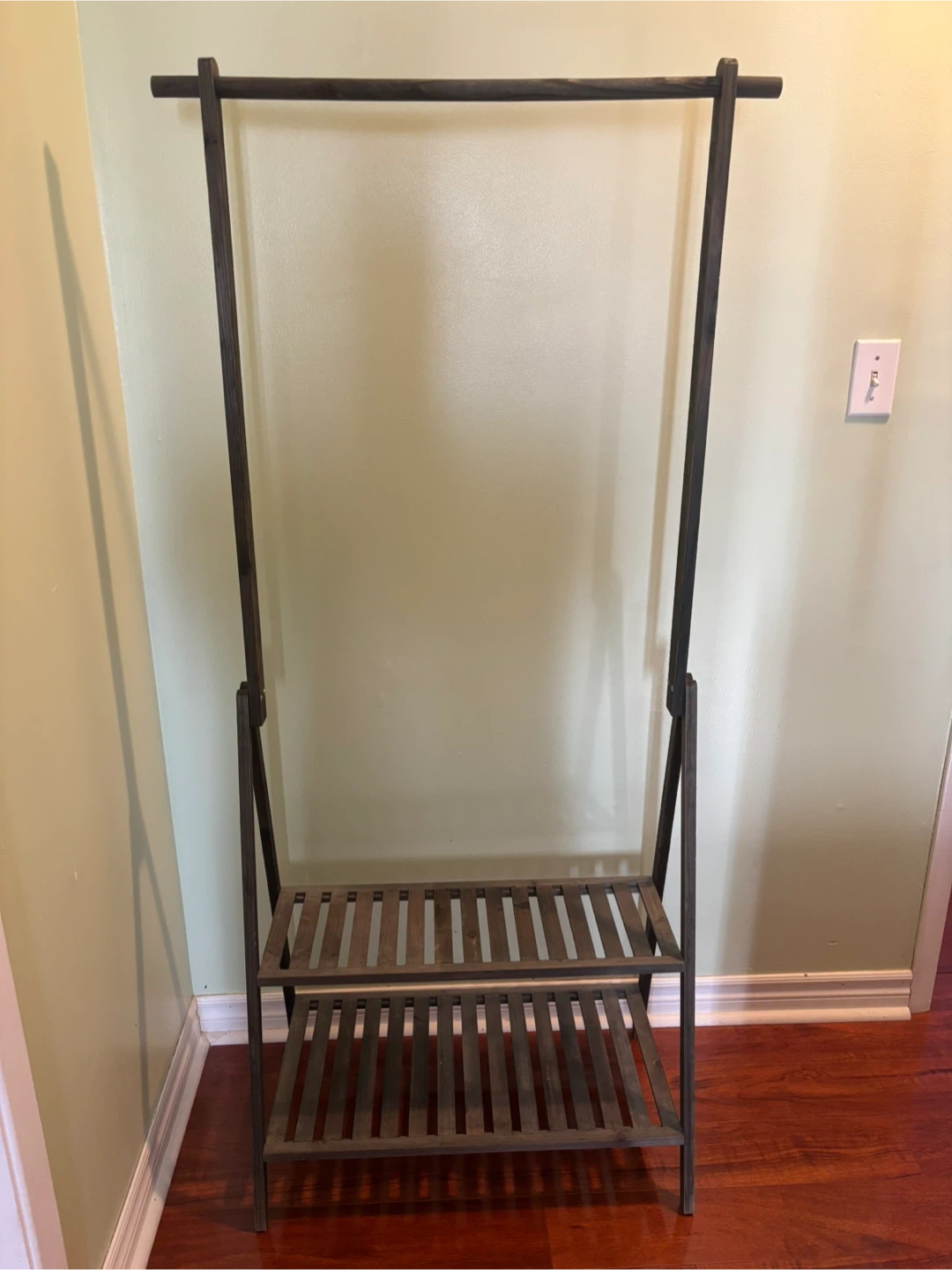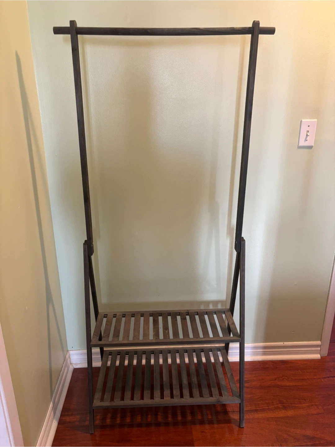 Selling a wooden garment rack with two shelves! It's great for adding extra storage and display space to any room. The rack measures approximately 32 inches wide, 16 inches deep, and 66 inches tall.
