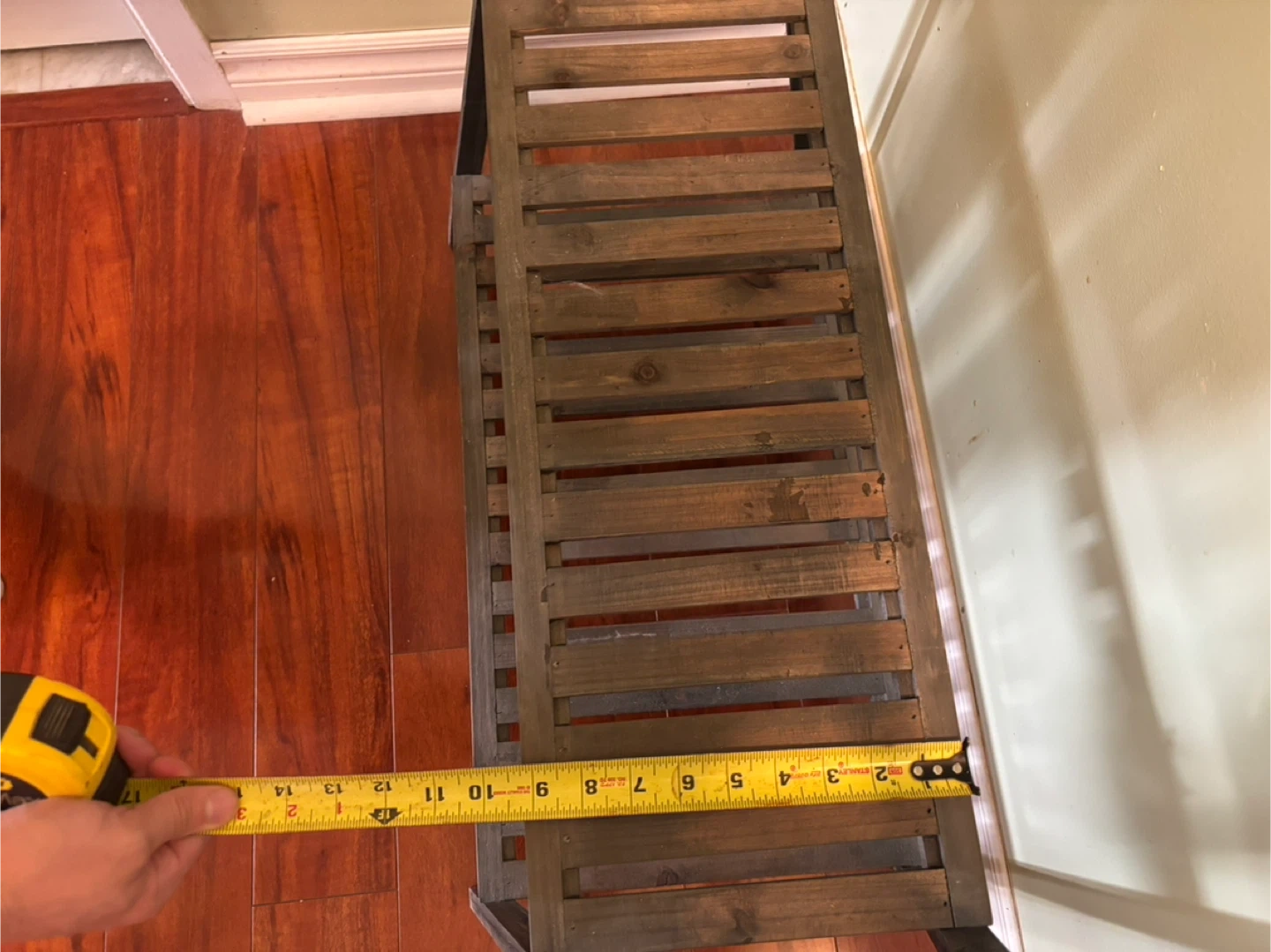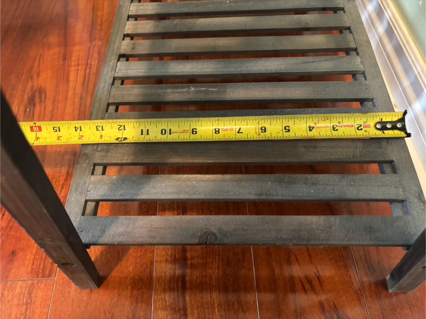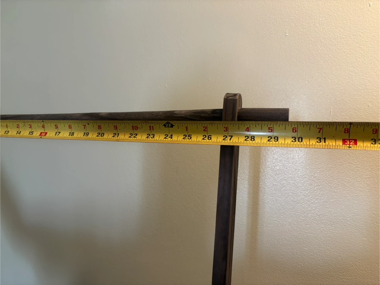 Selling a wooden garment rack with two shelves! It's great for adding extra storage and display space to any room. The rack measures approximately 32 inches wide, 16 inches deep, and 66 inches tall.