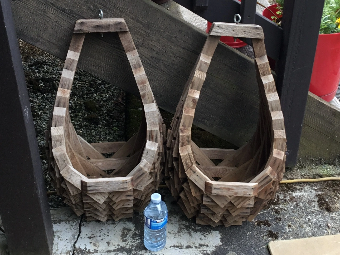 Two wooden hanging planters, each with a metal hook for hanging. These would be great for hanging herbs or flowers on a porch or patio.