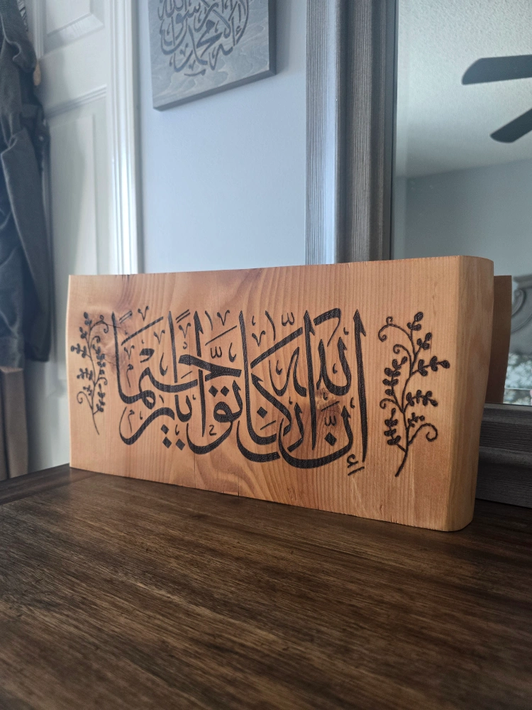 Handburnt on a wood slab. This piece sits nice on a table, shelf or even hung up on the wall. Translation: "Indeed, Allah is Ever-Returning, Most-Merciful". Stained in golden pecan Free delivery within Calgary SE/NE and Chestermere.