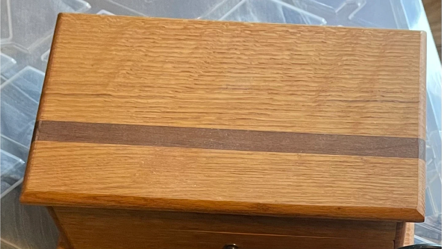 Selling a lovely wooden jewellery box! It has a drawer and a lift top. The inside is lined with green felt. Perfect for storing your precious items!