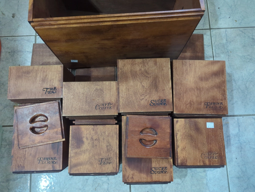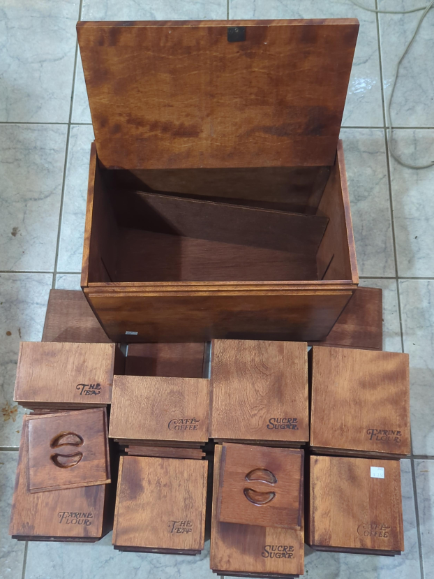 Selling a charming wooden kitchen canister set! Includes a large storage box with a hinged lid and smaller canisters for tea, coffee, sugar, and flour. A lovely addition to any kitchen with a rustic or vintage aesthetic. comes with removable plastic holders. for easy usage of foods. or remove the plastic and just use the wood.