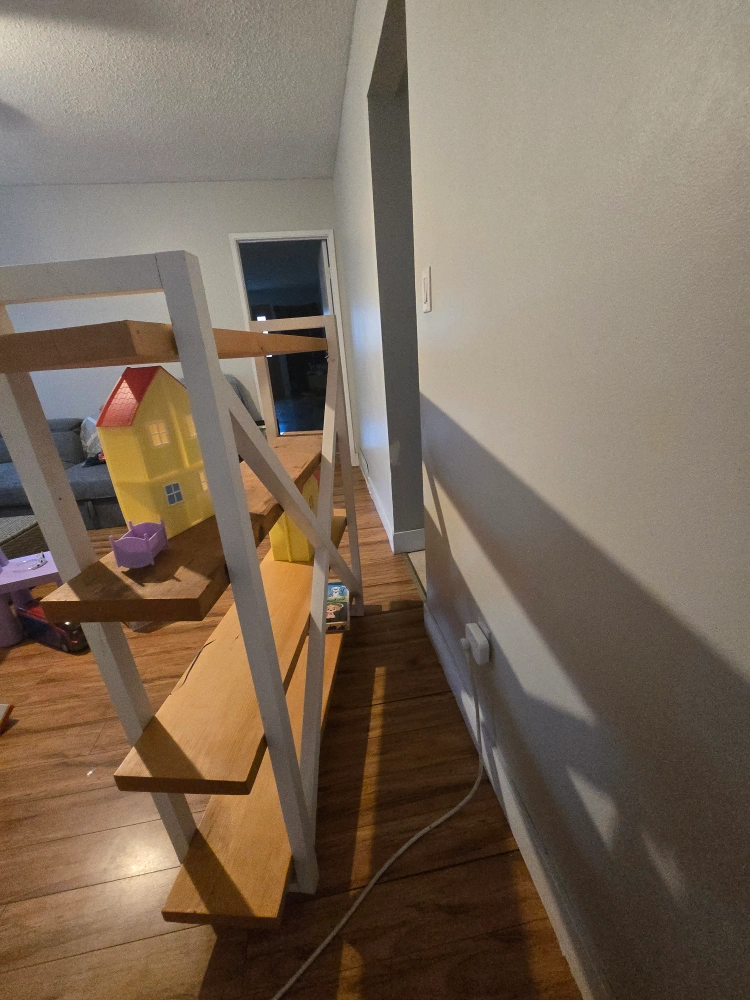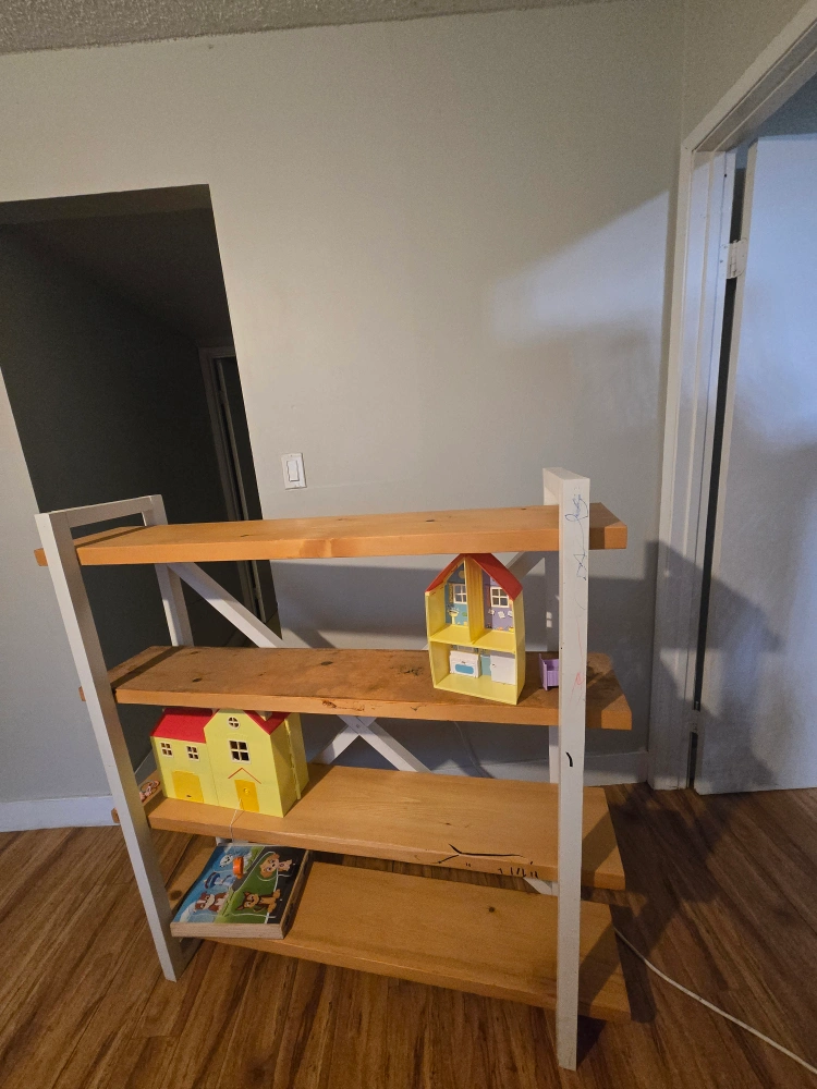 I'm selling a wooden ladder shelf. It has a rustic look with a white frame and natural wood shelves. It's perfect for displaying books, plants, or other decorative items. It's in great condition and ready for a new home