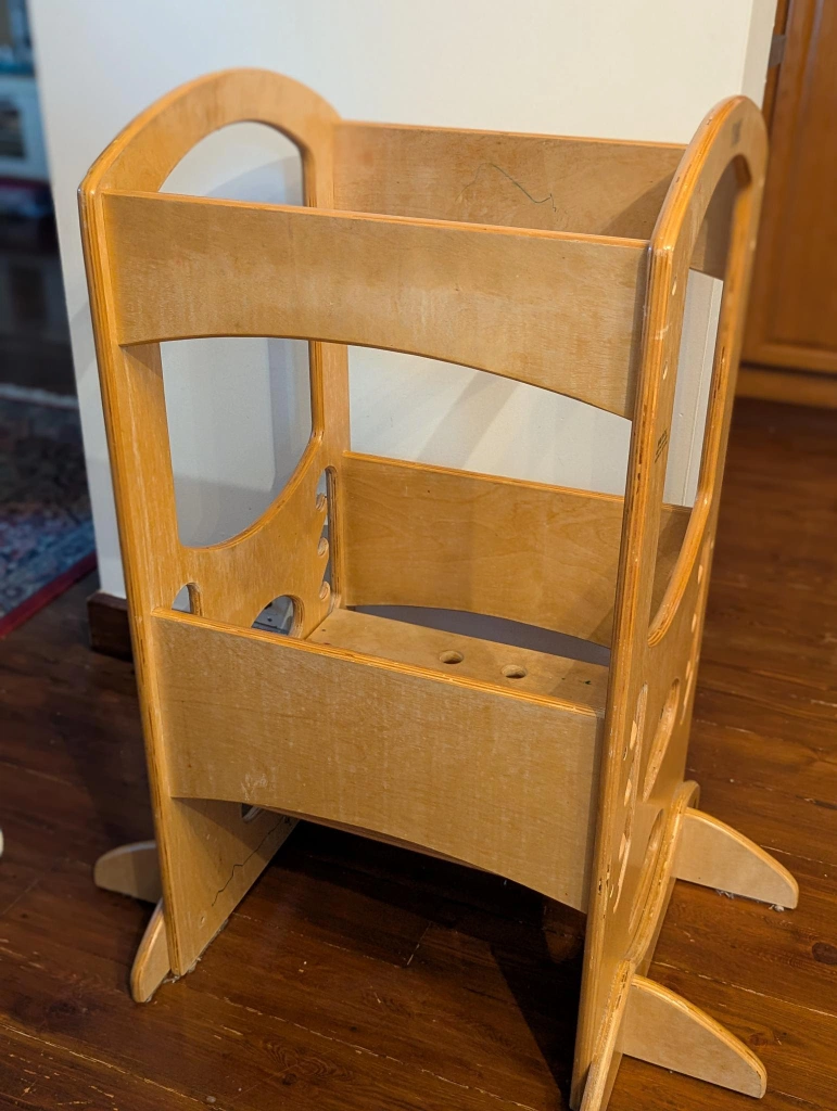 Sturdy Wooden Learning Tower Adjustable heights to grow with your child Brand The Learning Tower Good condition, perfectly sturdy, just some markings and colour fading in the wood pet-free, bug-free, smoke-free home