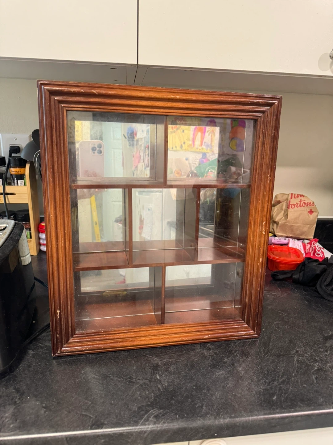 OBO Display case with glass door & mirrored back. It has hooks on the back so it can be hung up. Has some wear & tear but lots of life left! 16" H x 14" L x 3.5" D Pick up near otonabee & ashburnham.