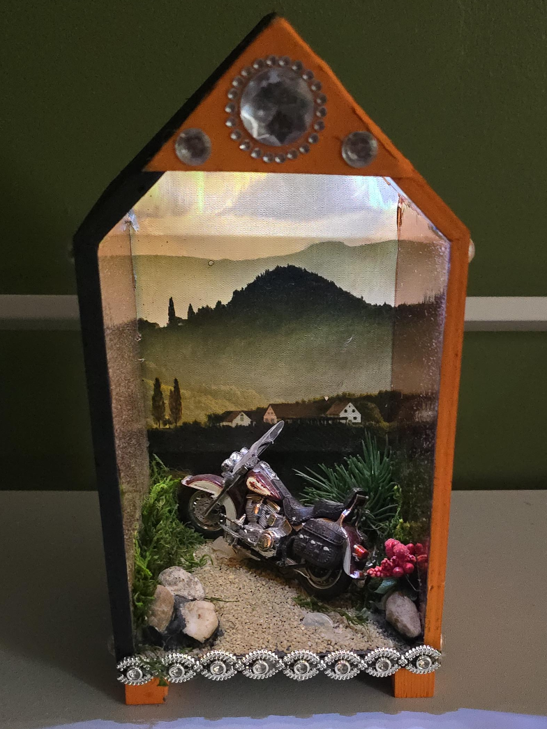 A unique wooden Harley Davidson display box. featuring a motorcycle scene inside a decorative and display case. It's a cool piece for any motorcycle enthusiast or collector to add to their space.