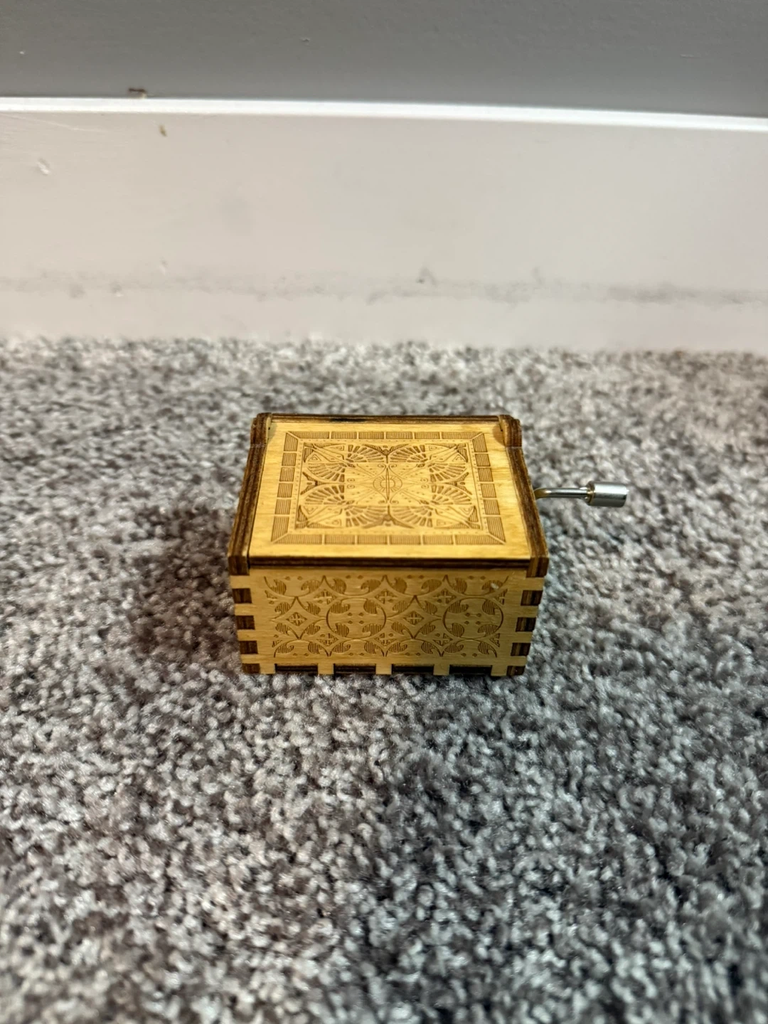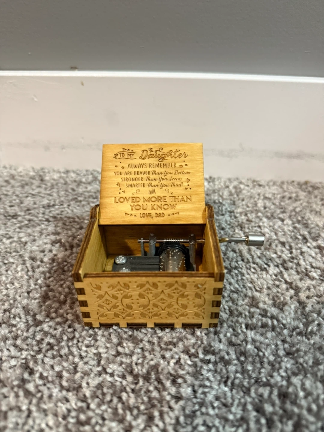 A sweet wooden music box with the inscription "To My Daughter - Always remember you are braver than you believe, stronger than you seem, smarter than you think, and loved more than you know - Love, Dad". It's in great condition and plays a lovely tune!