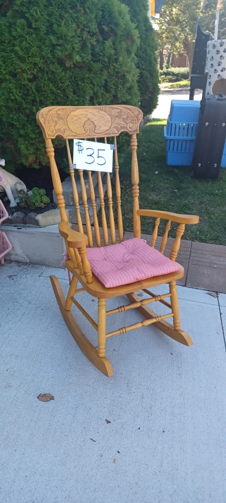Classic wooden rocking chair with a comfy pink striped cushion! Perfect for relaxing on the porch or in the living room. Asking $35 PLEASE CALL NOT TEXT.... 519 729-5862 415 Victoria st south kitchener