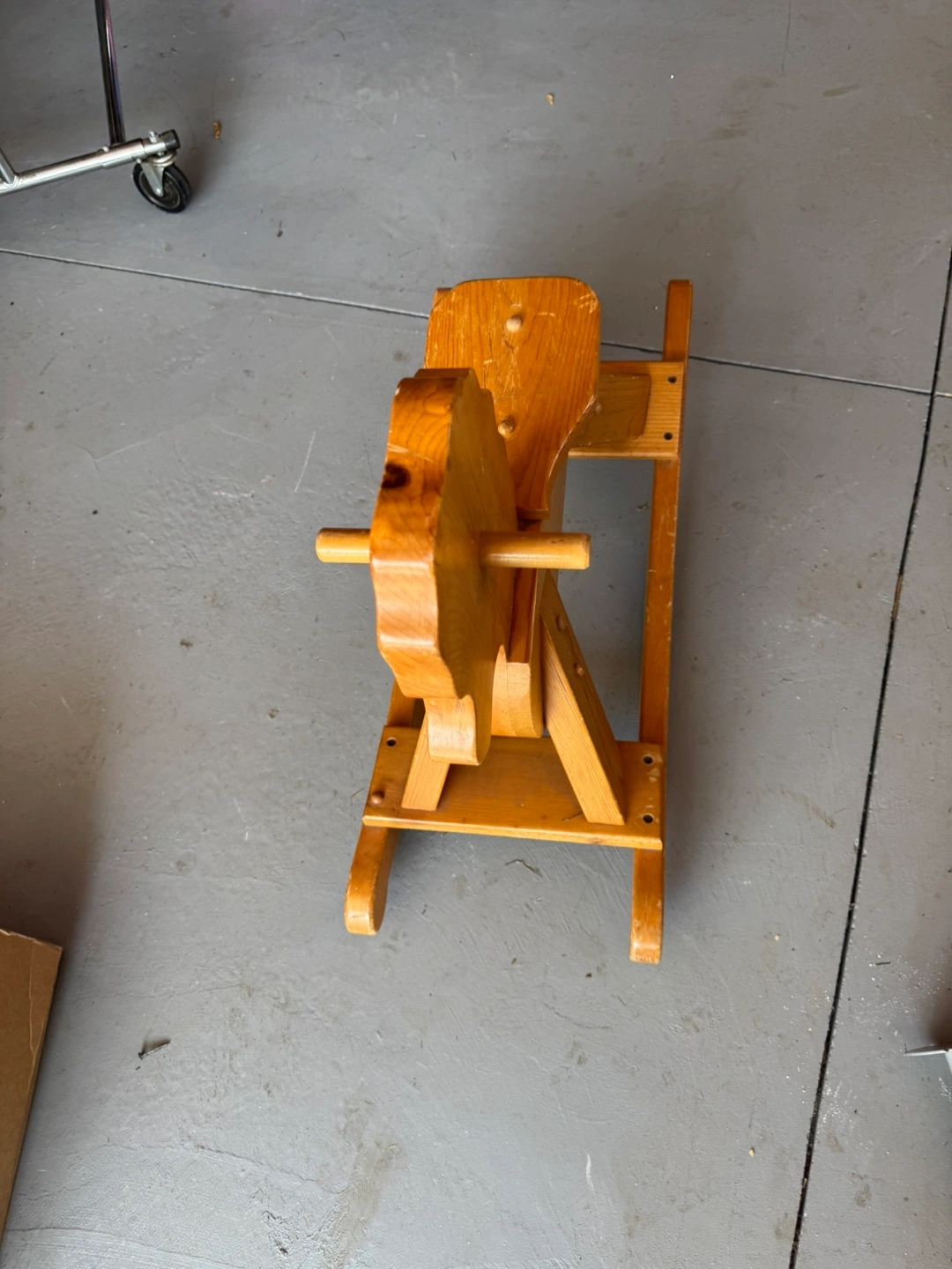Selling a classic wooden rocking horse! It's a charming, sturdy toy perfect for little ones. It has a natural wood finish and a simple, timeless design. It has some signs of wear but is still in good condition for hours of fun!