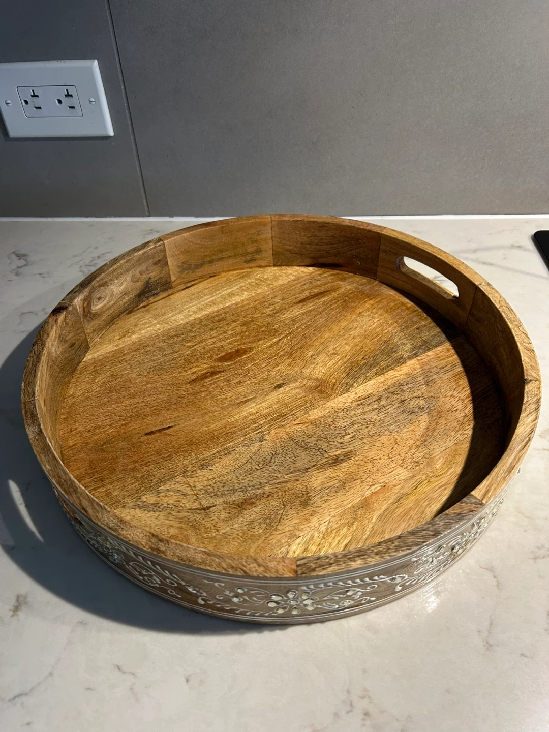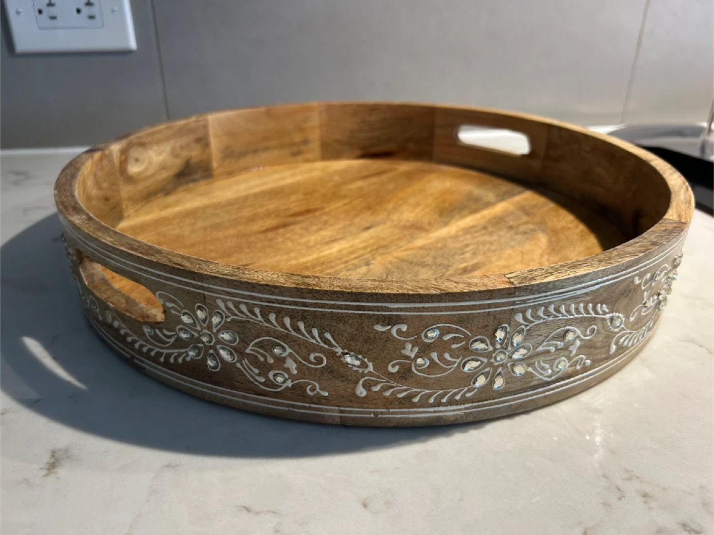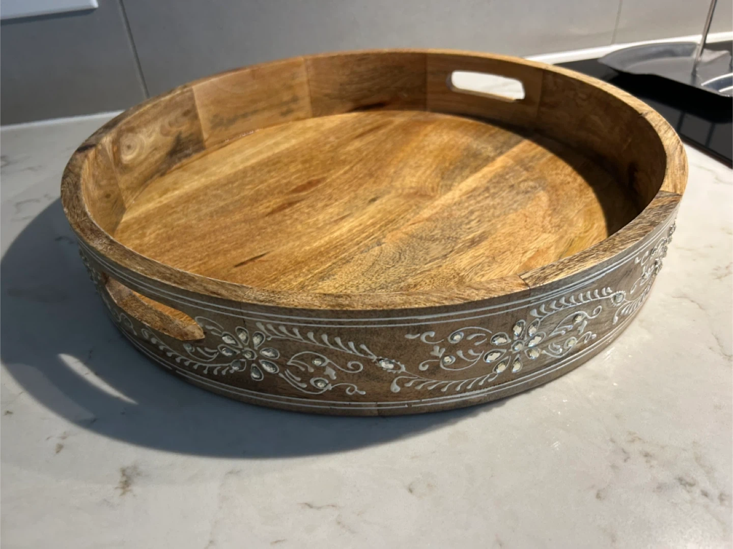 Selling a wooden round serving tray. It's perfect for serving drinks or snacks. The tray has a decorative floral design around the edge and handles for easy carrying. It's in great condition and ready for a new home!