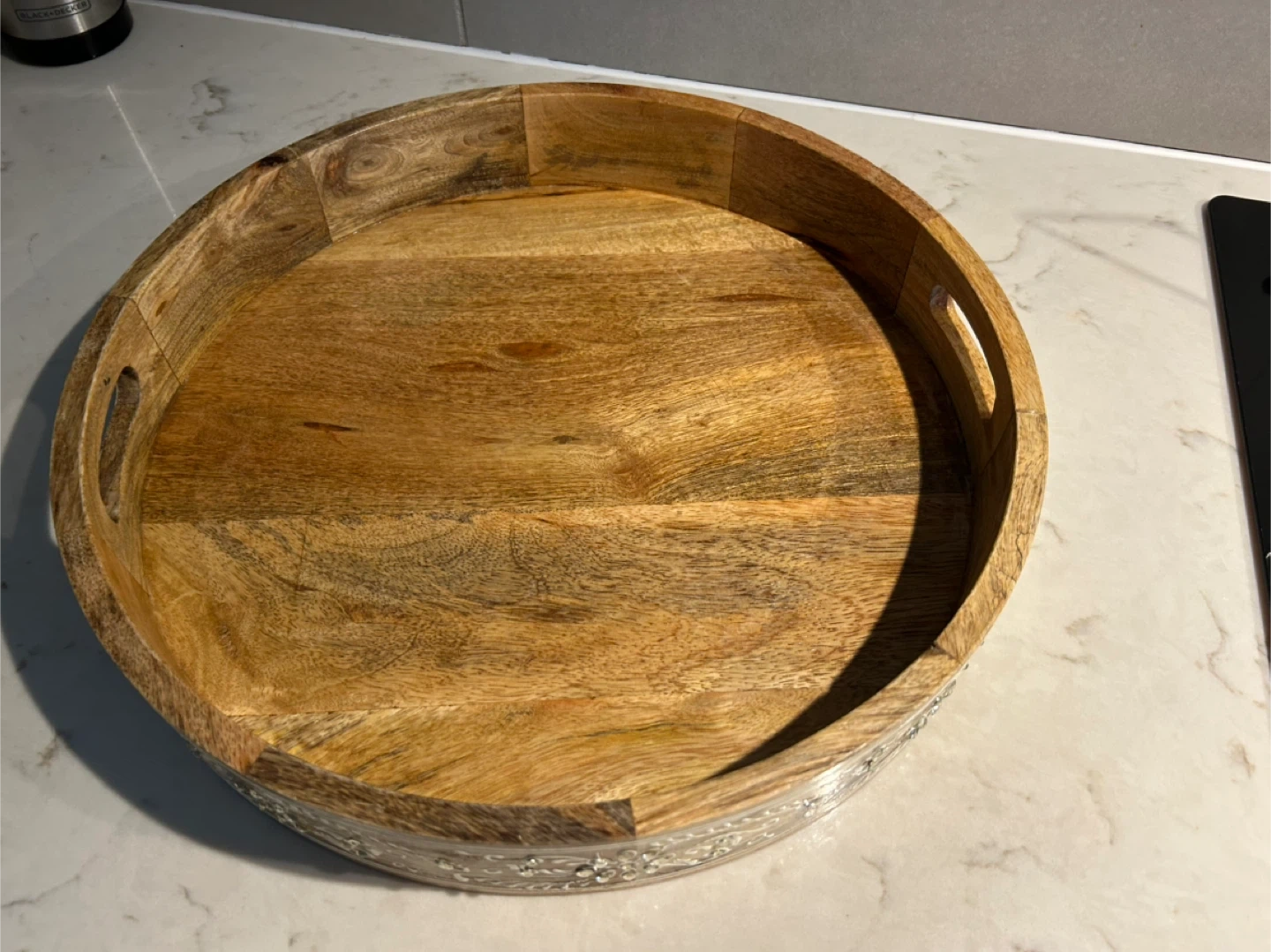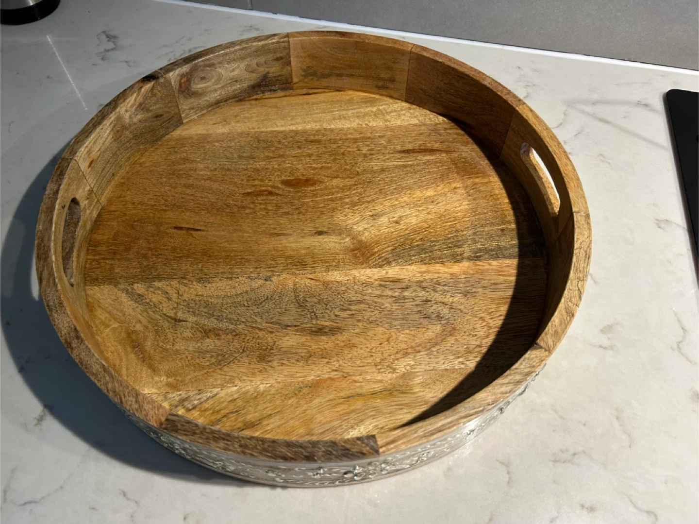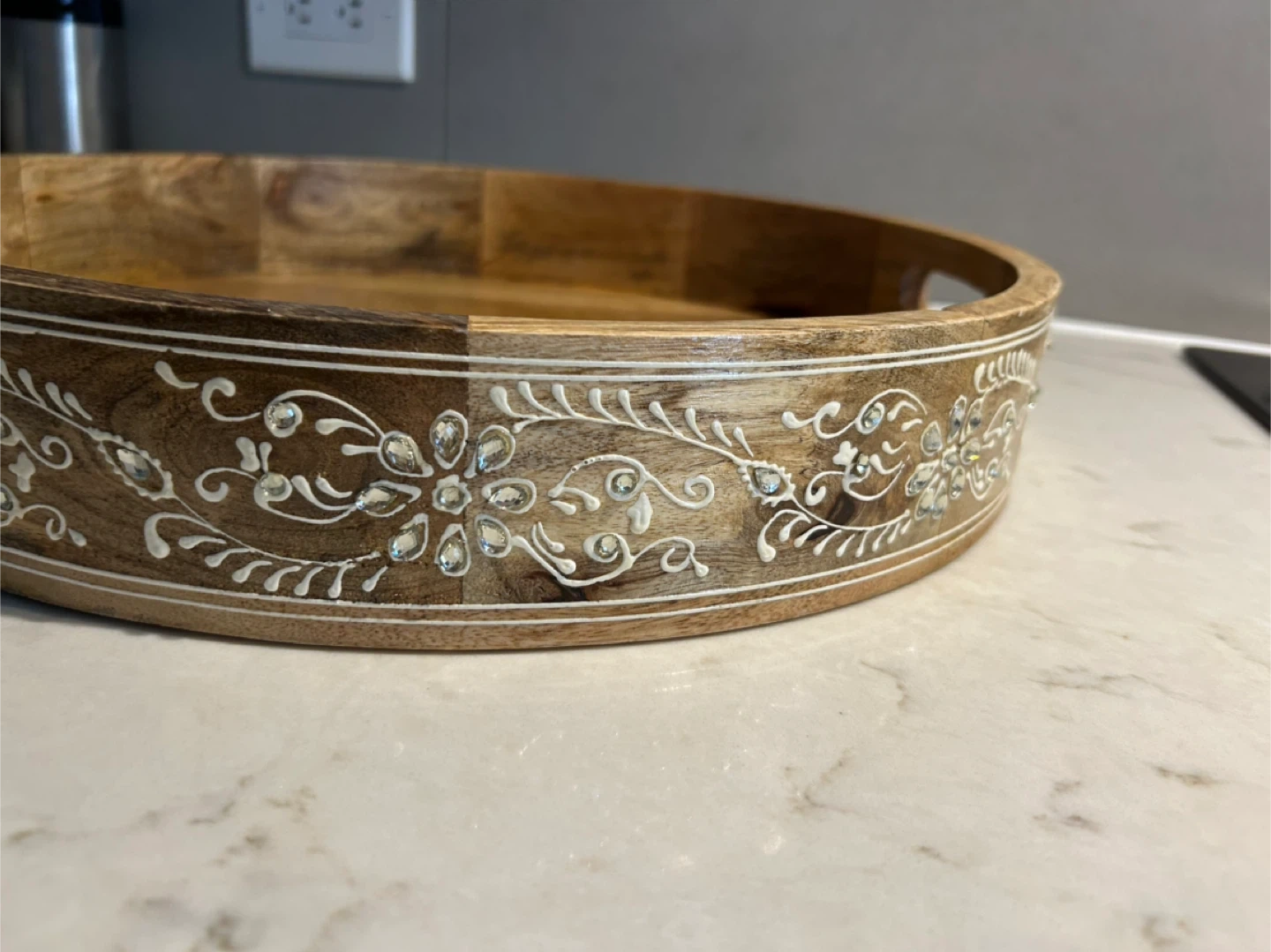 Selling a wooden round serving tray. It's perfect for serving drinks or snacks. The tray has a decorative floral design around the edge and handles for easy carrying. It's in great condition and ready for a new home!