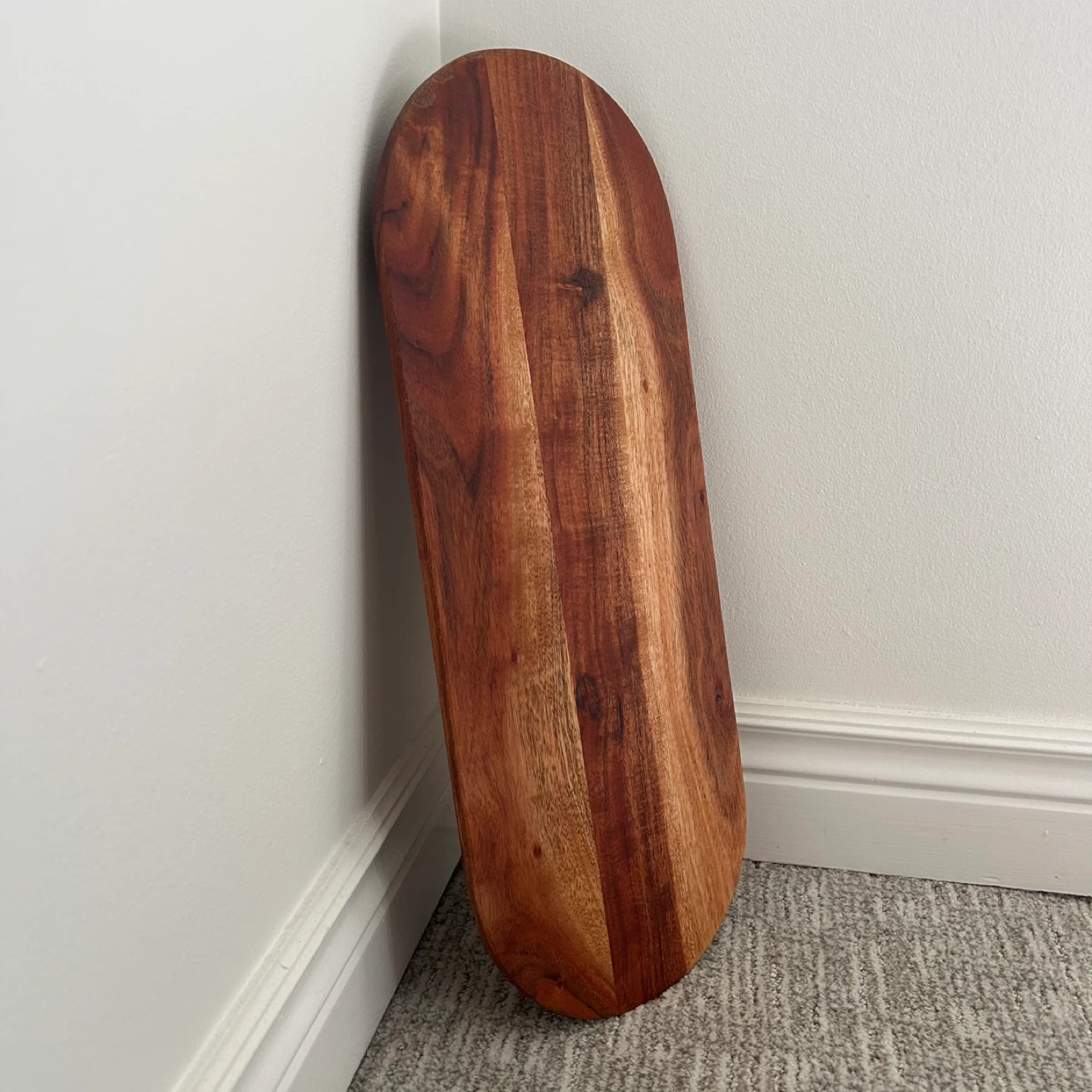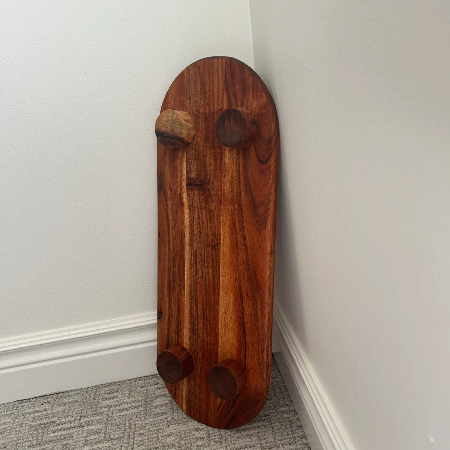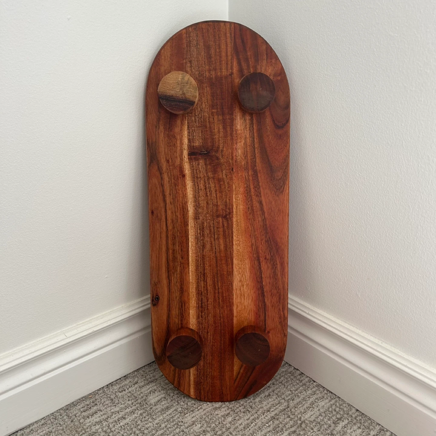 Wooden Serving Board With Beautiful Wood Grain Top And 4 Round Wood Feet Underneath Which Gives It A multipurpose Use That Could Be Used As A Centrepiece, Serving Tray And Charcuterie Board (Dimensions) Board Length - 19 1/2 Inches Board Width - 7 1/4 Inches Board Thickness - 1/2 Of An Inch Board Height With Feet - 1 1/2 Inches