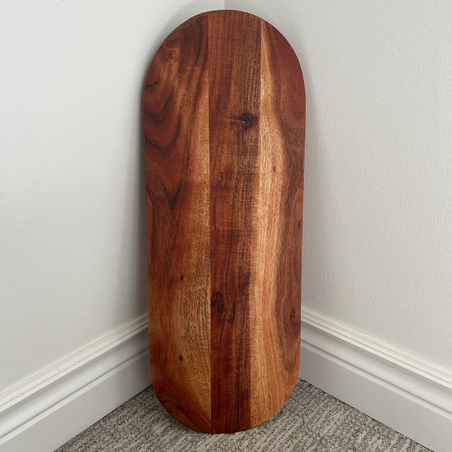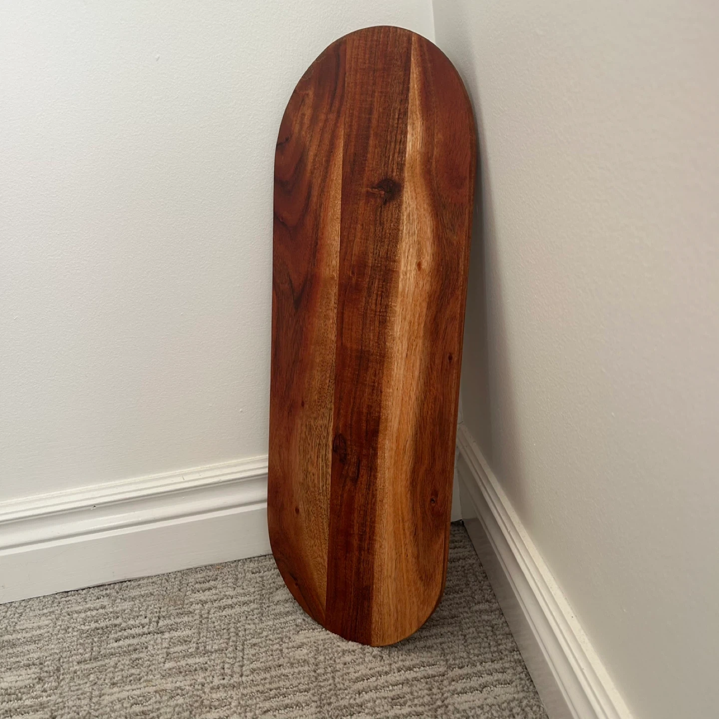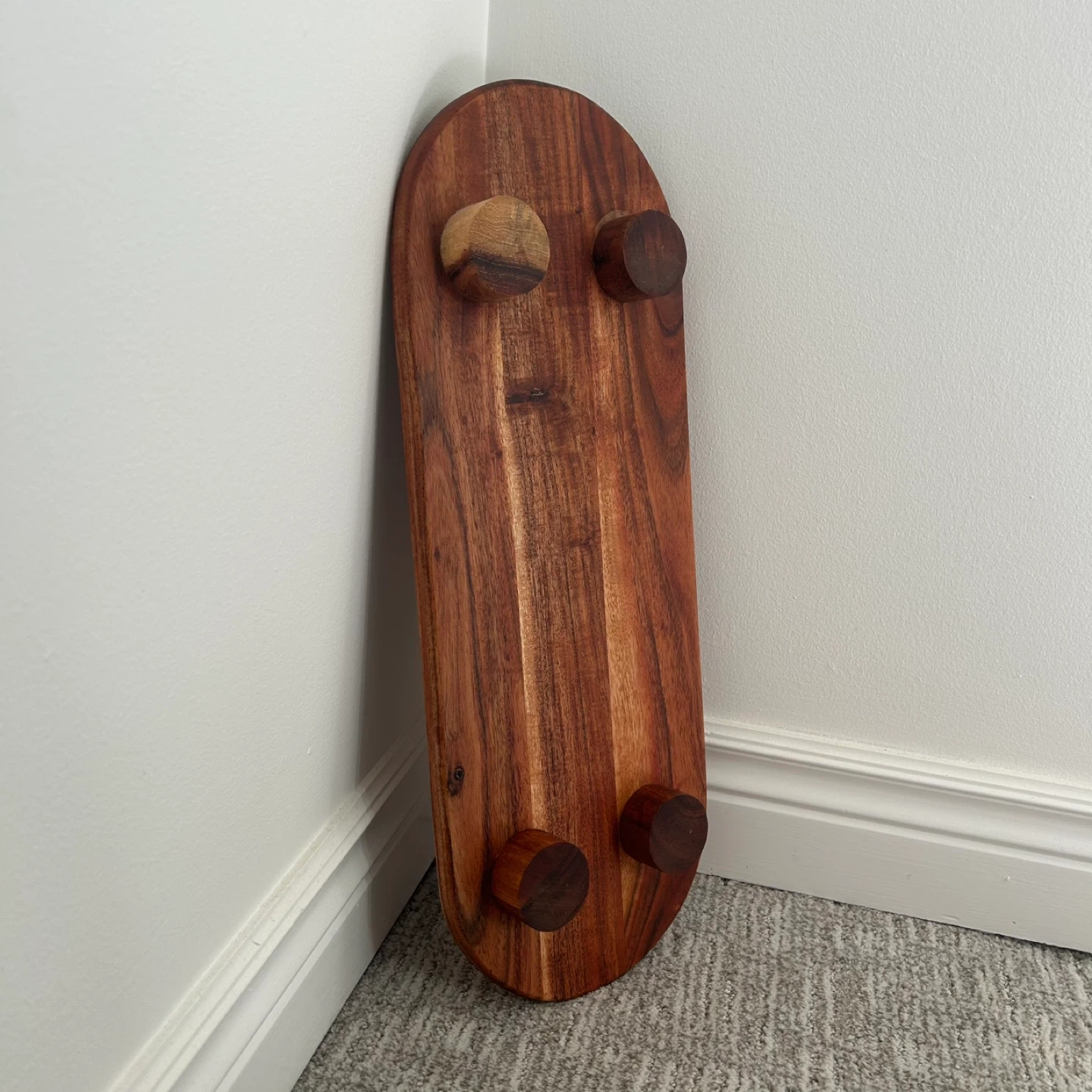 Wooden Serving Board With Beautiful Wood Grain Top And 4 Round Wood Feet Underneath Which Gives It A multipurpose Use That Could Be Used As A Centrepiece, Serving Tray And Charcuterie Board (Dimensions) Board Length - 19 1/2 Inches Board Width - 7 1/4 Inches Board Thickness - 1/2 Of An Inch Board Height With Feet - 1 1/2 Inches