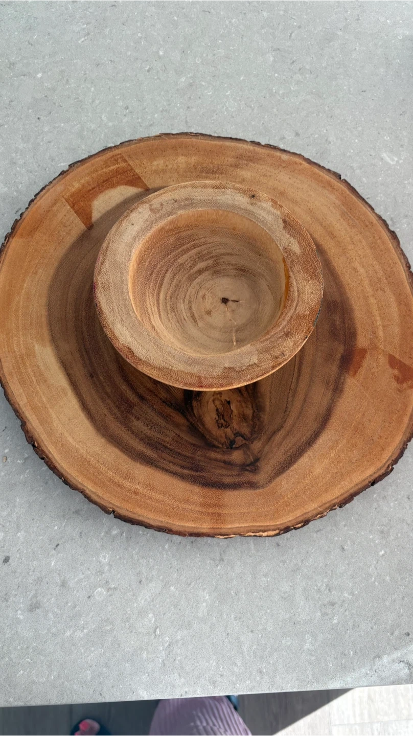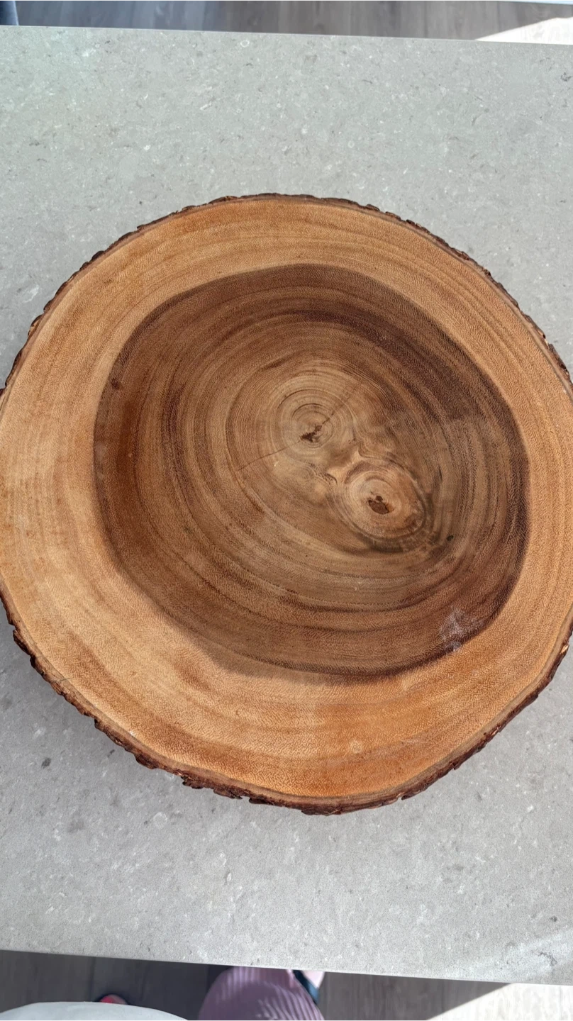 Selling a wooden serving tray! It's perfect for displaying snacks or desserts. It's made of natural wood and has a rustic look that would look great in any kitchen or dining room